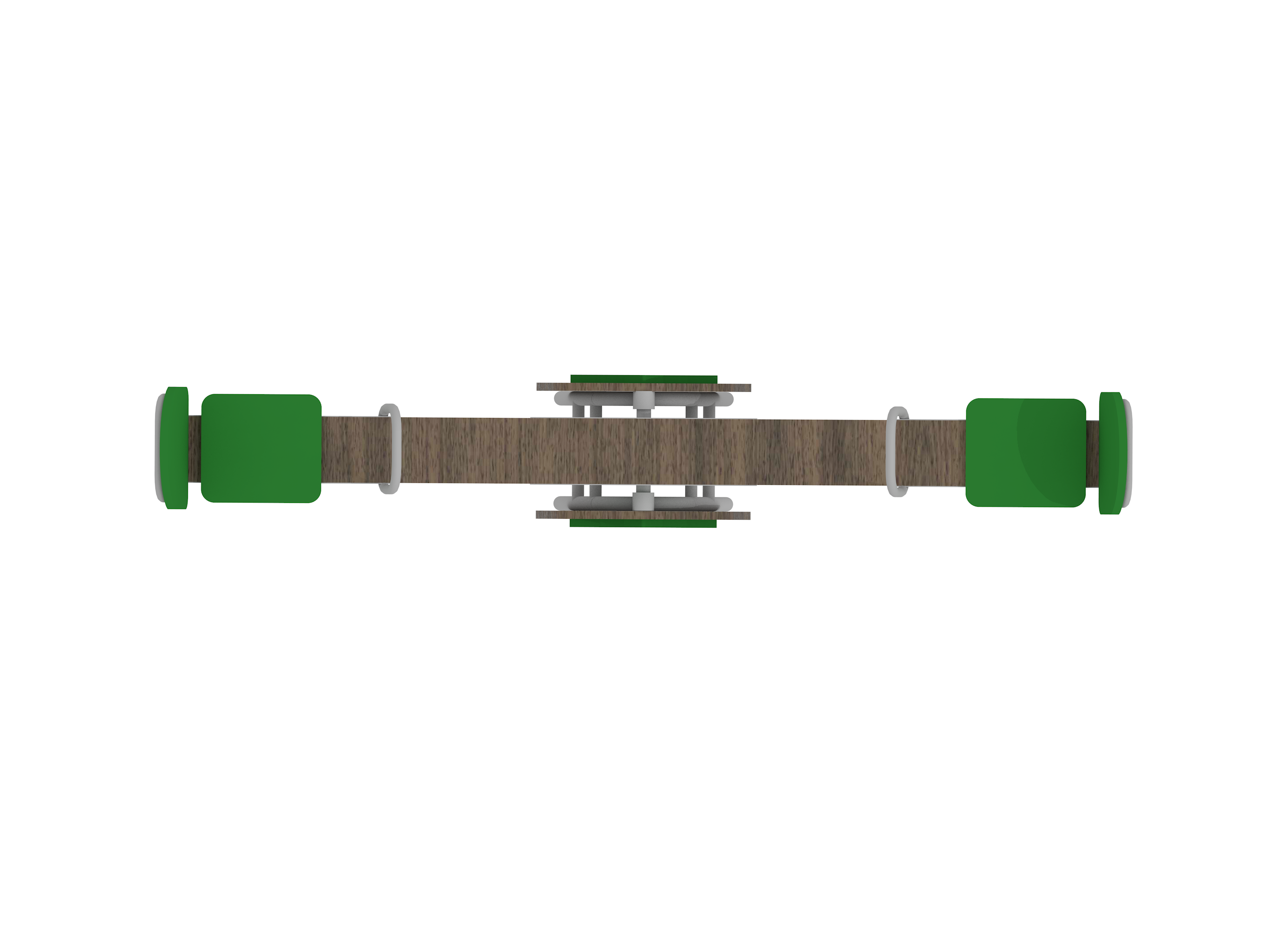 Сиденья с высокой спинкой и удобными ручками, декоративные элементы в виде ёлочек на опорах. Мягкие резиновые демпферы на концах балки обеспечивают плавное и безопасное приземление. Конструкция рассчитана на интенсивную эксплуатацию и соответствует современным стандартам безопасности.