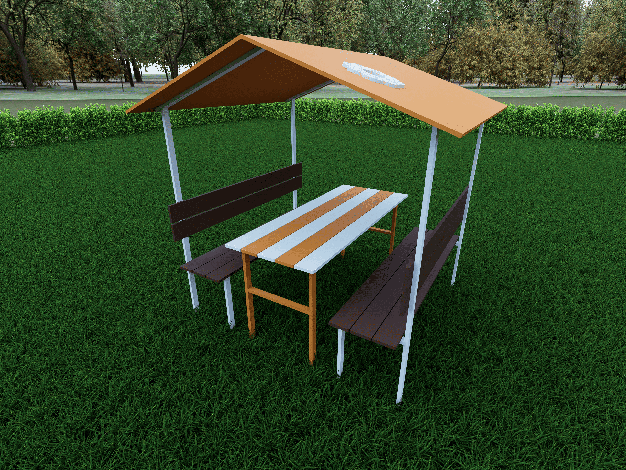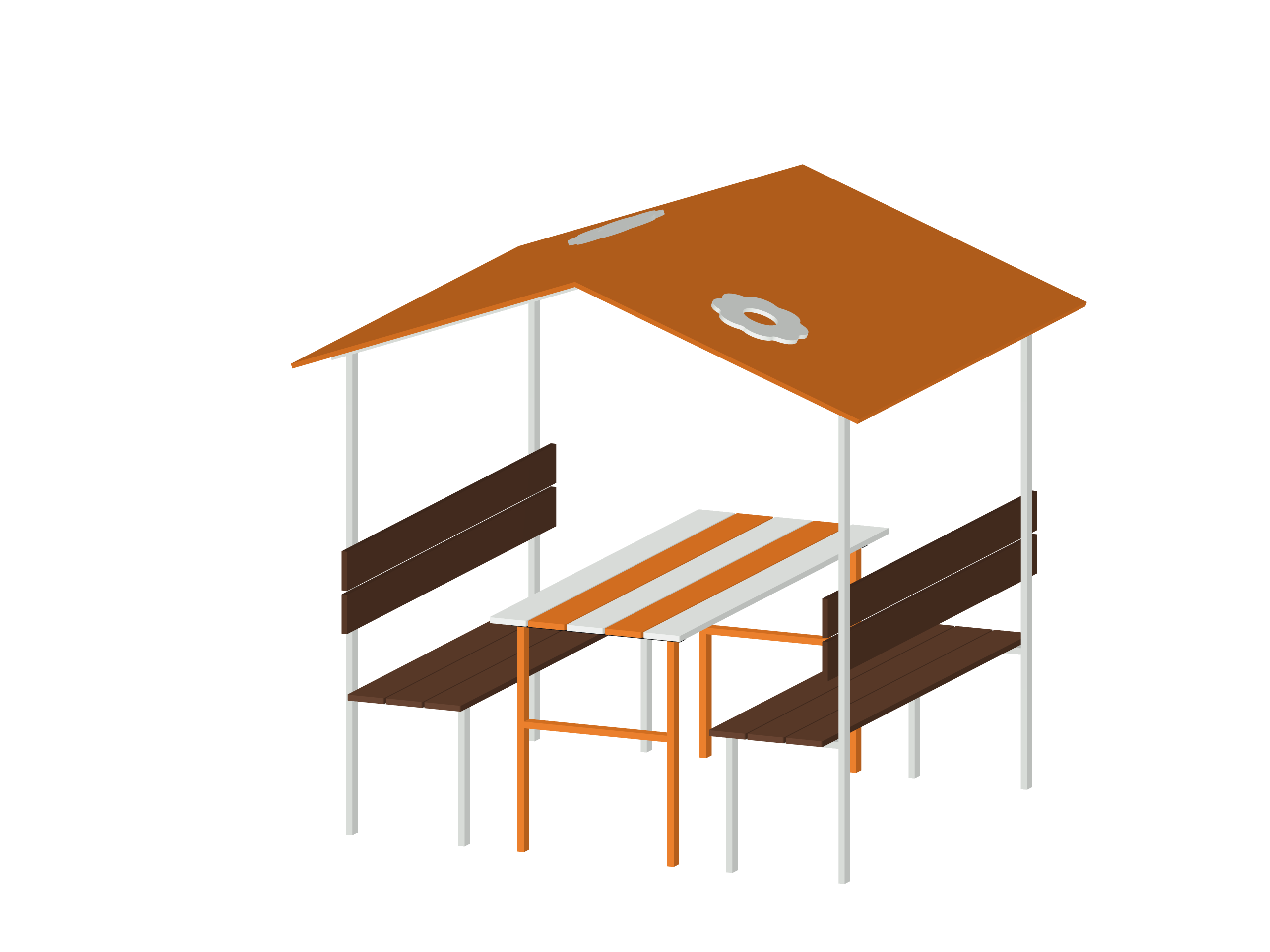 Многофункциональный комплекс, совмещающий укрытие и оборудованную зону для деятельности. Конструкция включает навес, стационарный стол и интегрированные скамьи, изготовленные из безопасных материалов (металл, фанера). Цветовая гамма (коричневый, оранжевый, белый) соответствует современным стандартам детских пространств. Комплект отличается прочностью, устойчивостью к погоде и вандалоустойчивостью.