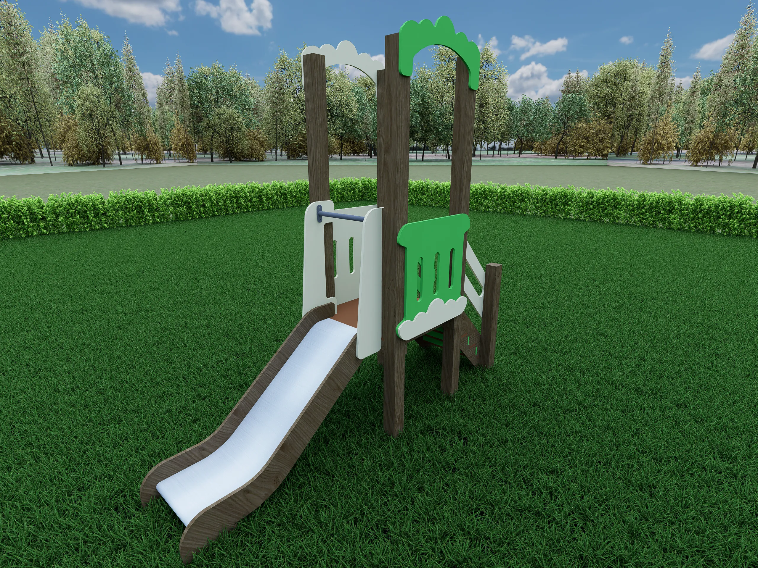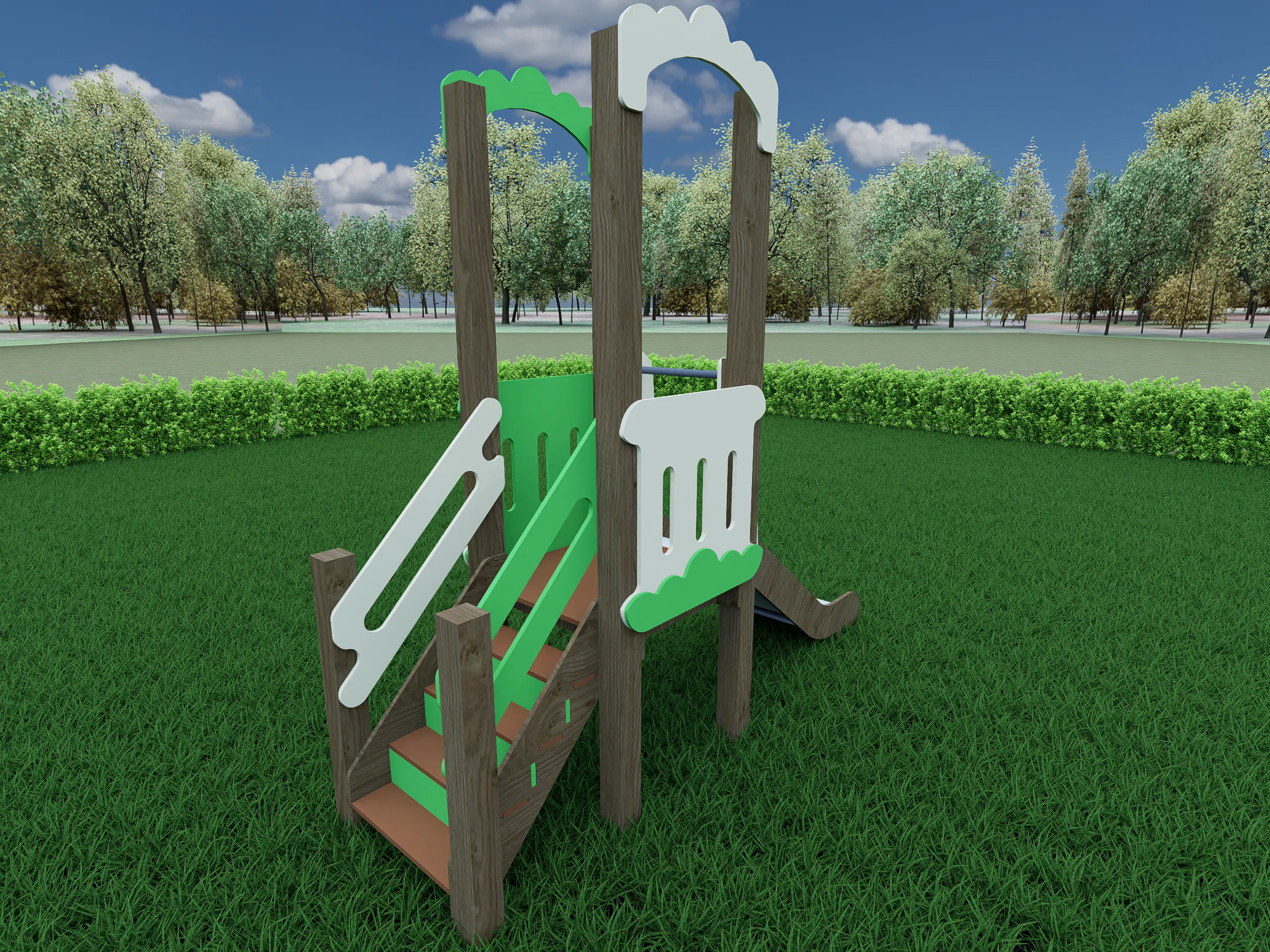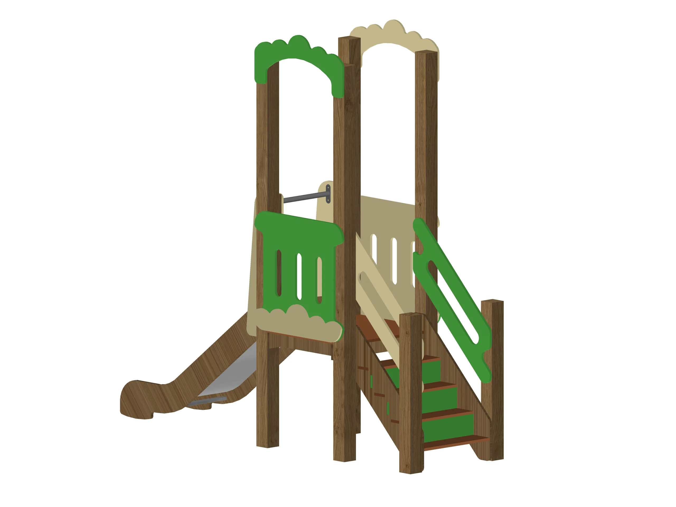 Компактный игровой комплекс в природной цветовой гамме с деревянными опорами, удобной лестницей и безопасной горкой. Площадка оборудована ограждениями и декоративными элементами в виде арок, создающими уютный и привлекательный внешний вид. Конструкция подходит для активных игр, развивает координацию и уверенность в движениях. Надёжные материалы рассчитаны на интенсивную эксплуатацию на открытом воздухе.