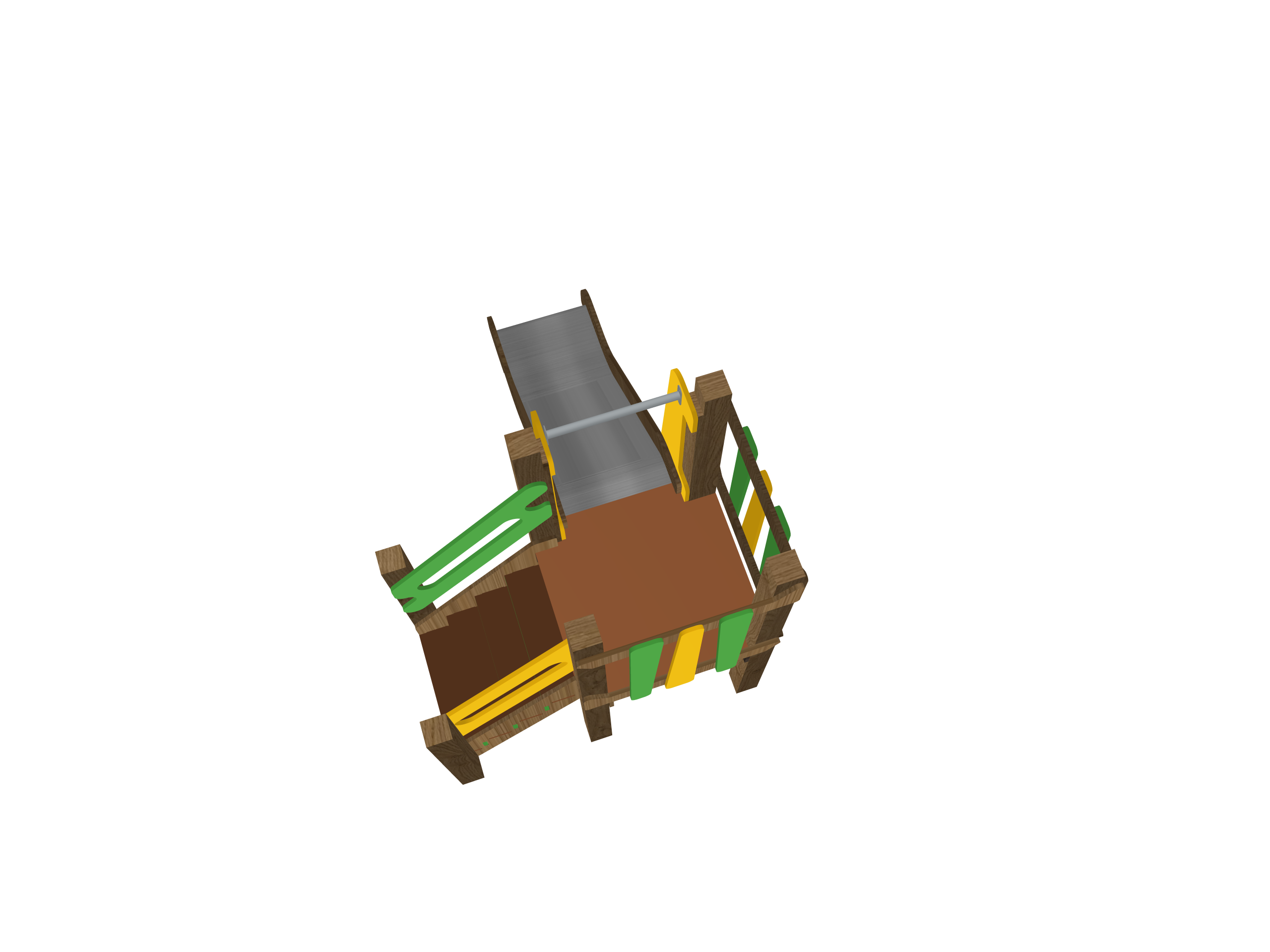 Компактный игровой комплекс с комбинированной конструкцией: обработанная древесина + усиленные металлические элементы в яркой жёлто-зелёной гамме с тёплыми коричневыми тонами.