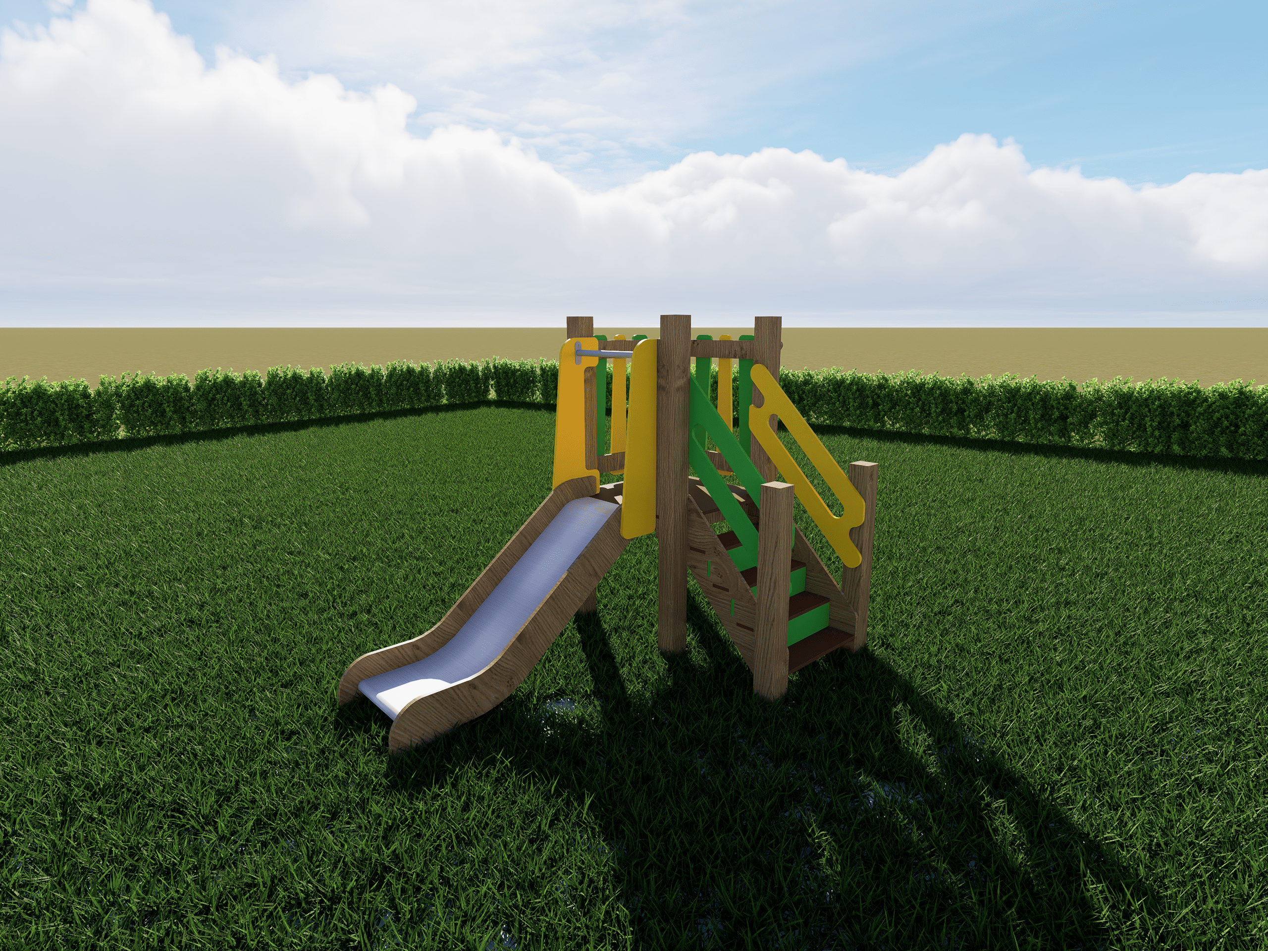 Развивает ловкость, координацию и уверенность при подъёме и спуске. Отличный выбор для небольших дворов, детских садов и жилых комплексов — солнечный дизайн с чёткими цветовыми зонами делает площадку заметной и привлекательной, а продуманная компактность позволяет детям быстро осваивать все элементы и играть без скуки.