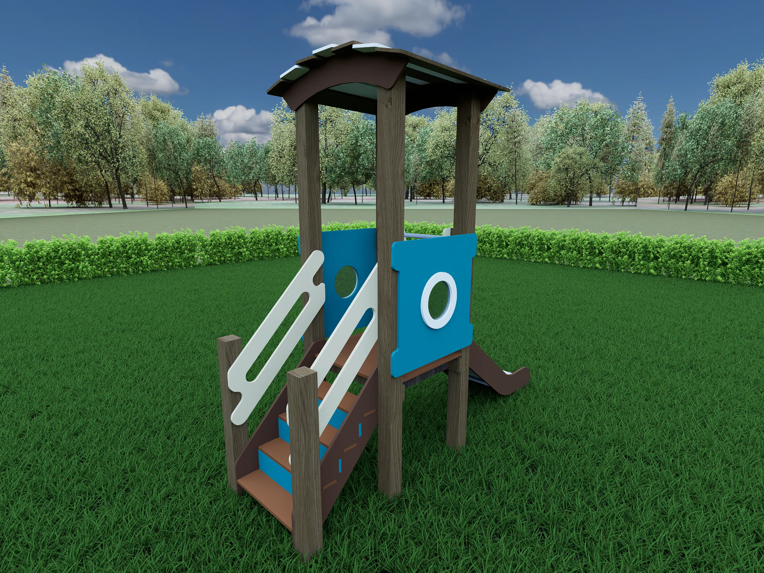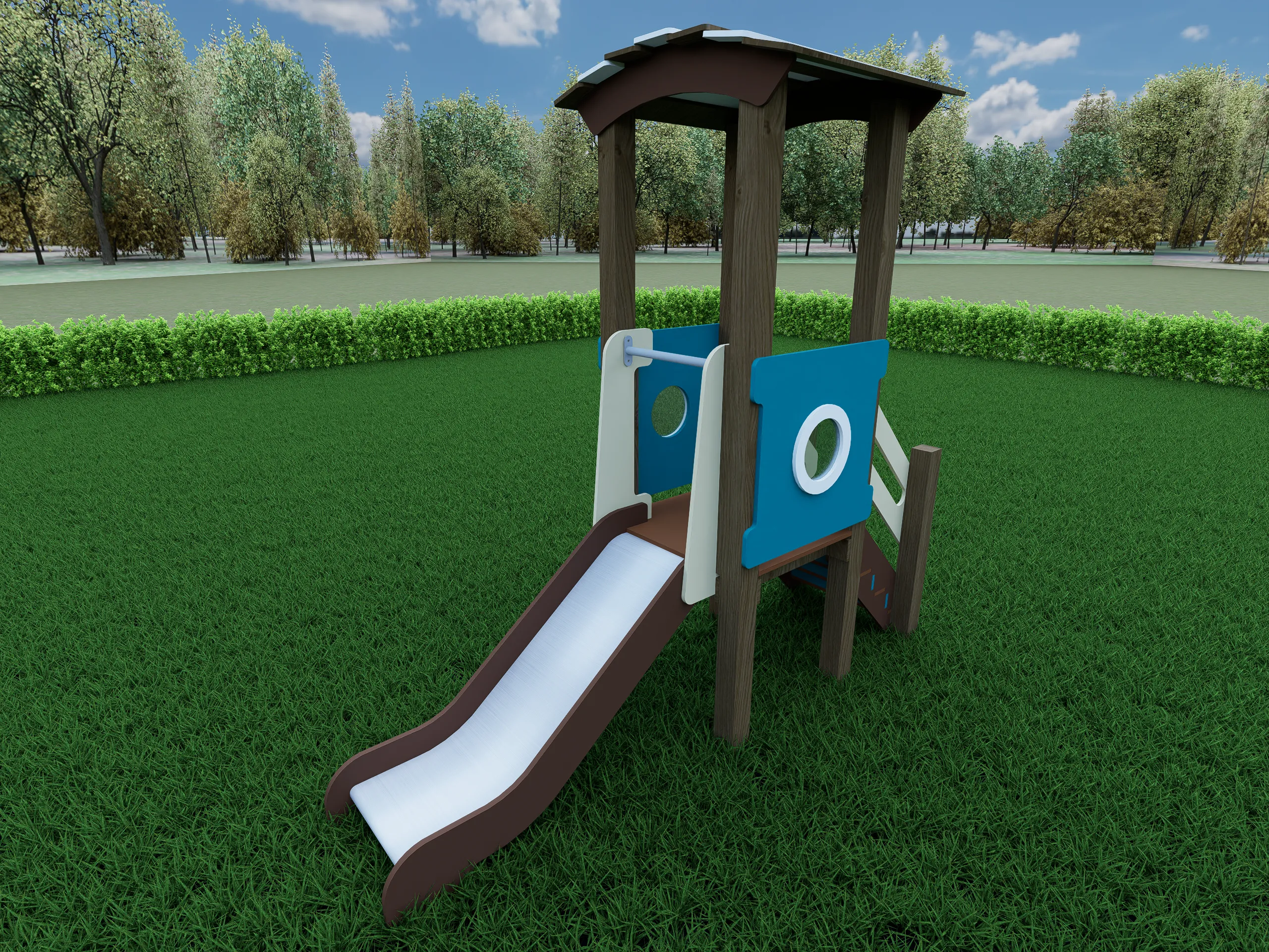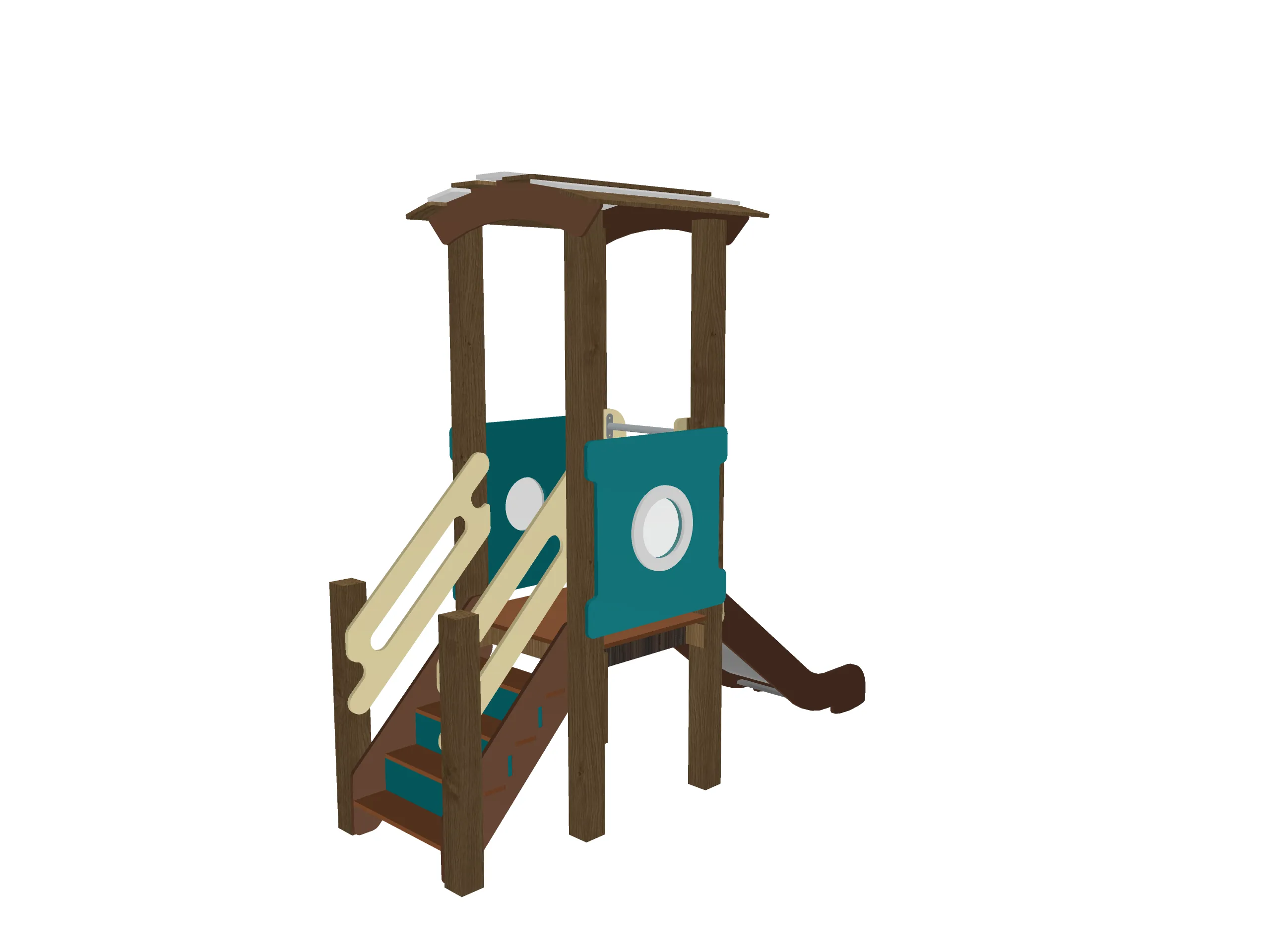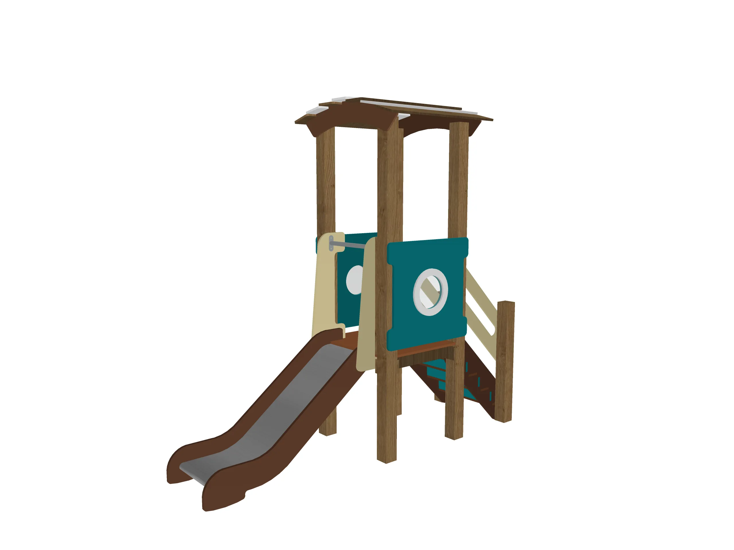 Компактный игровой комплекс с башней под декоративной крышей, удобной лестницей и безопасной горкой. Боковые панели с круглыми окошками придают конструкции аккуратный и современный вид. Ограждения и поручни обеспечивают комфортный подъём и спуск. Комплекс подходит для активных игр, развивает координацию и уверенность в движениях. Прочная конструкция рассчитана на установку на открытых площадках.