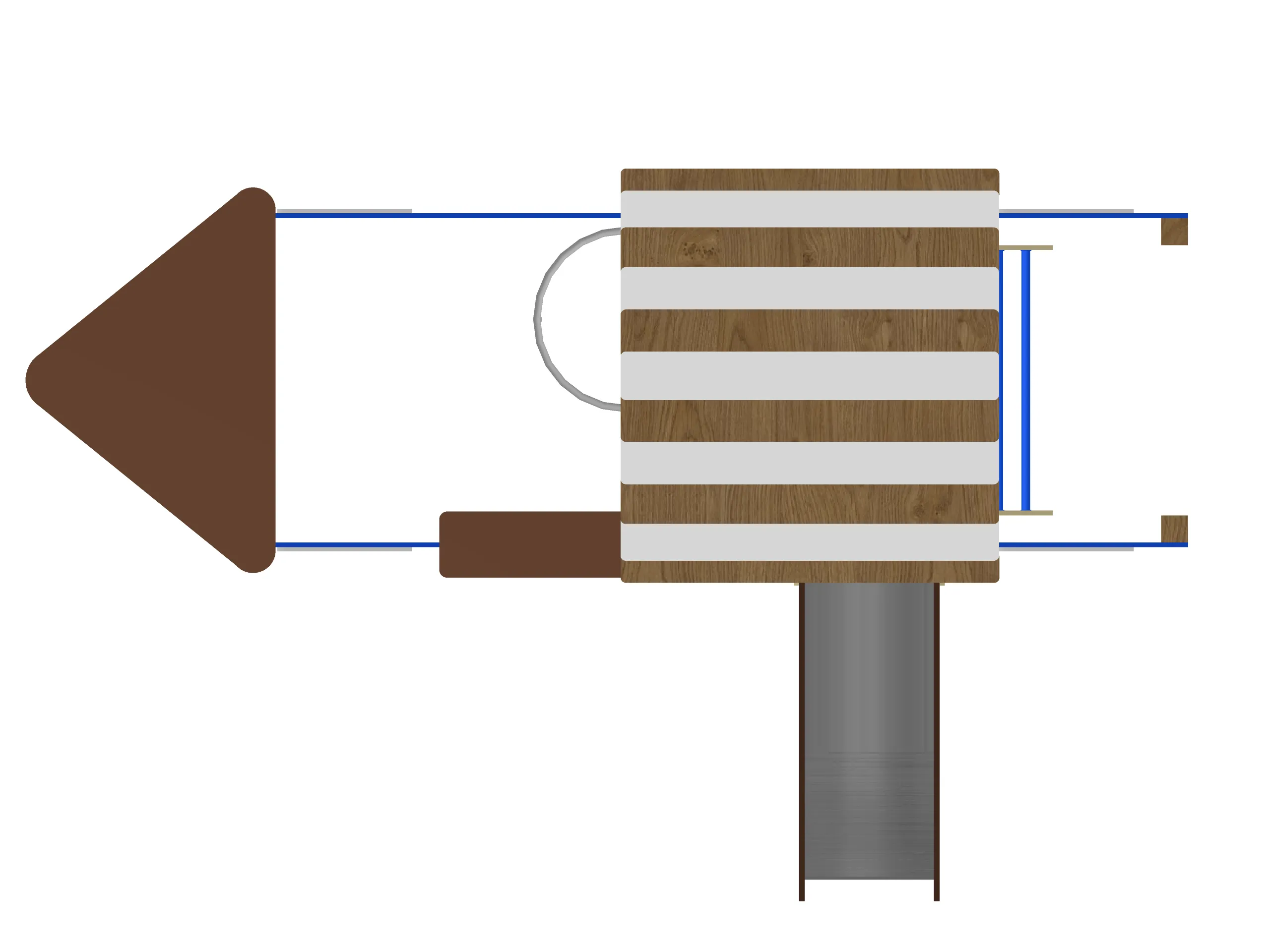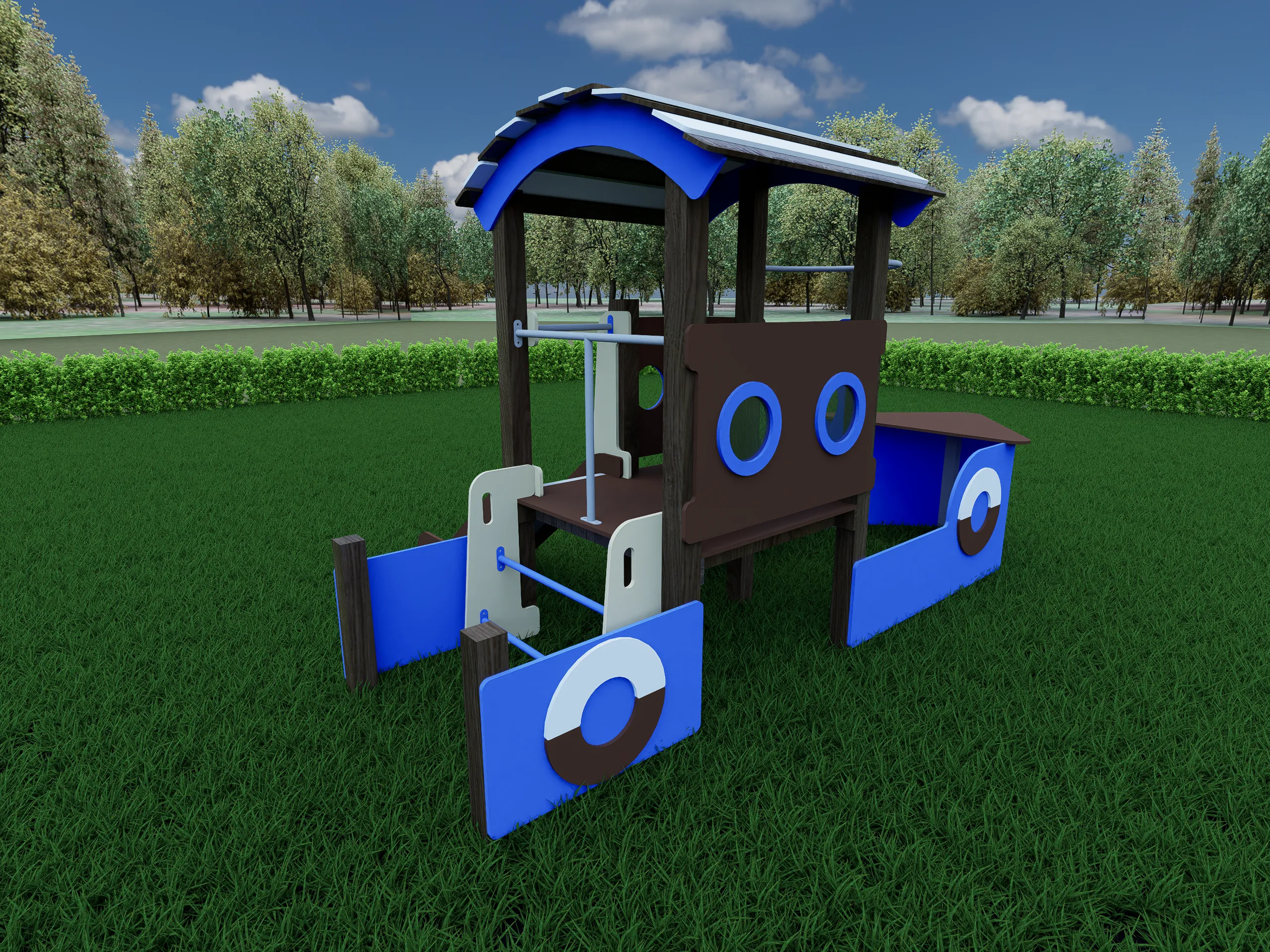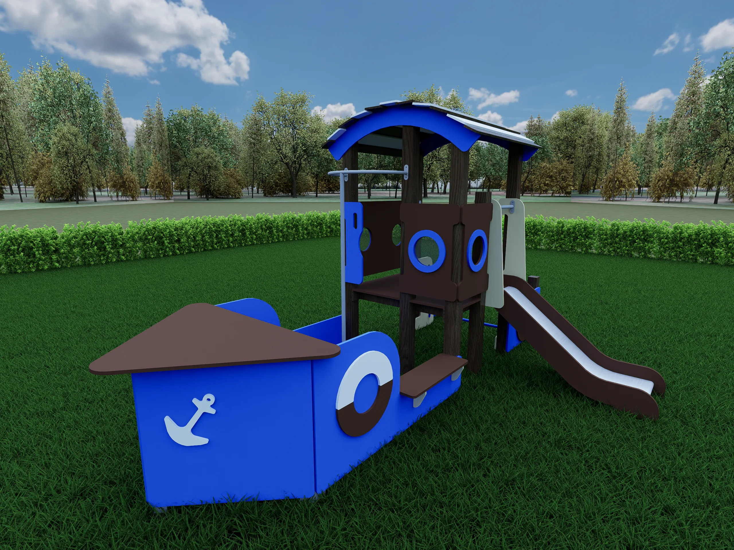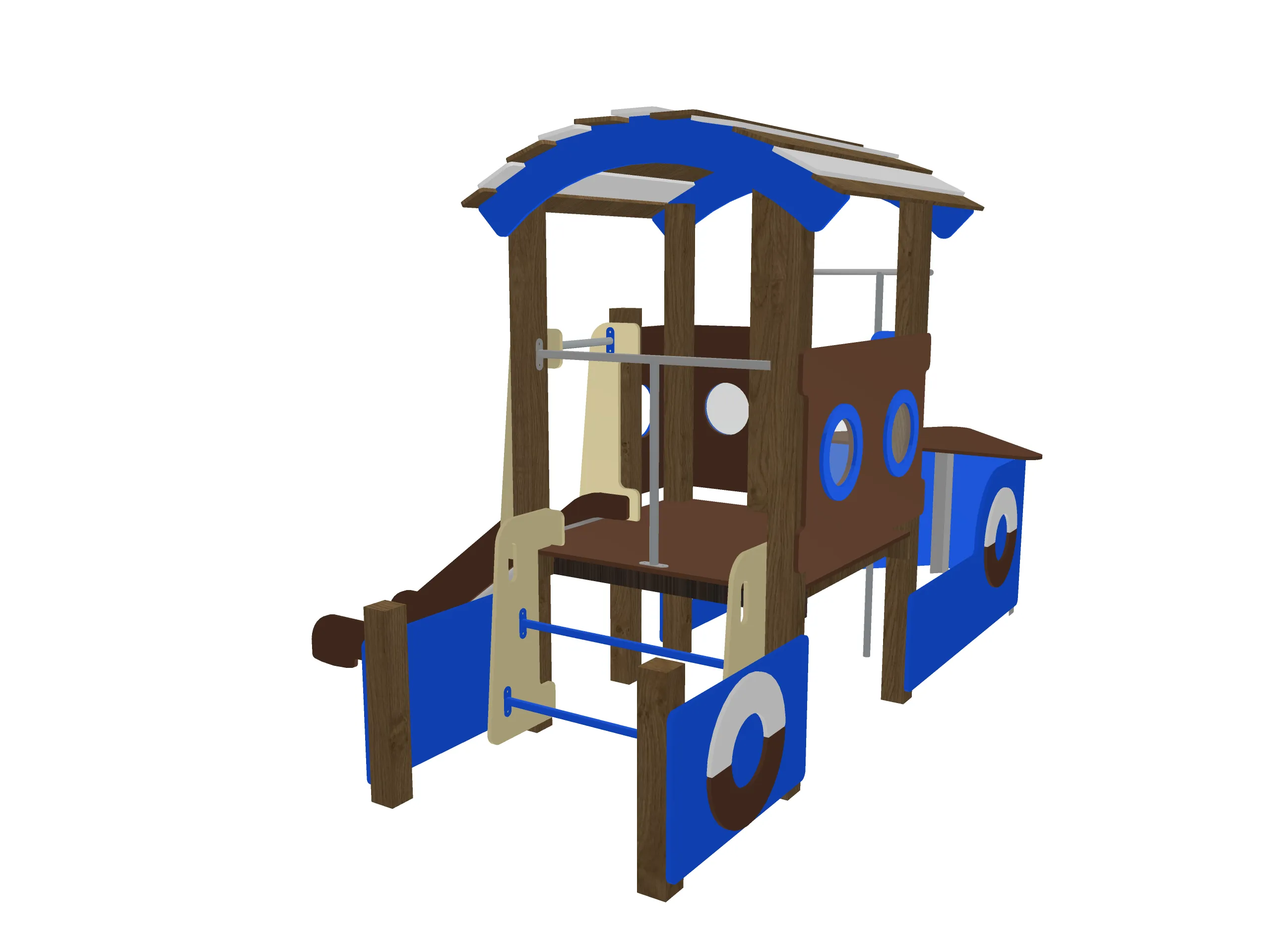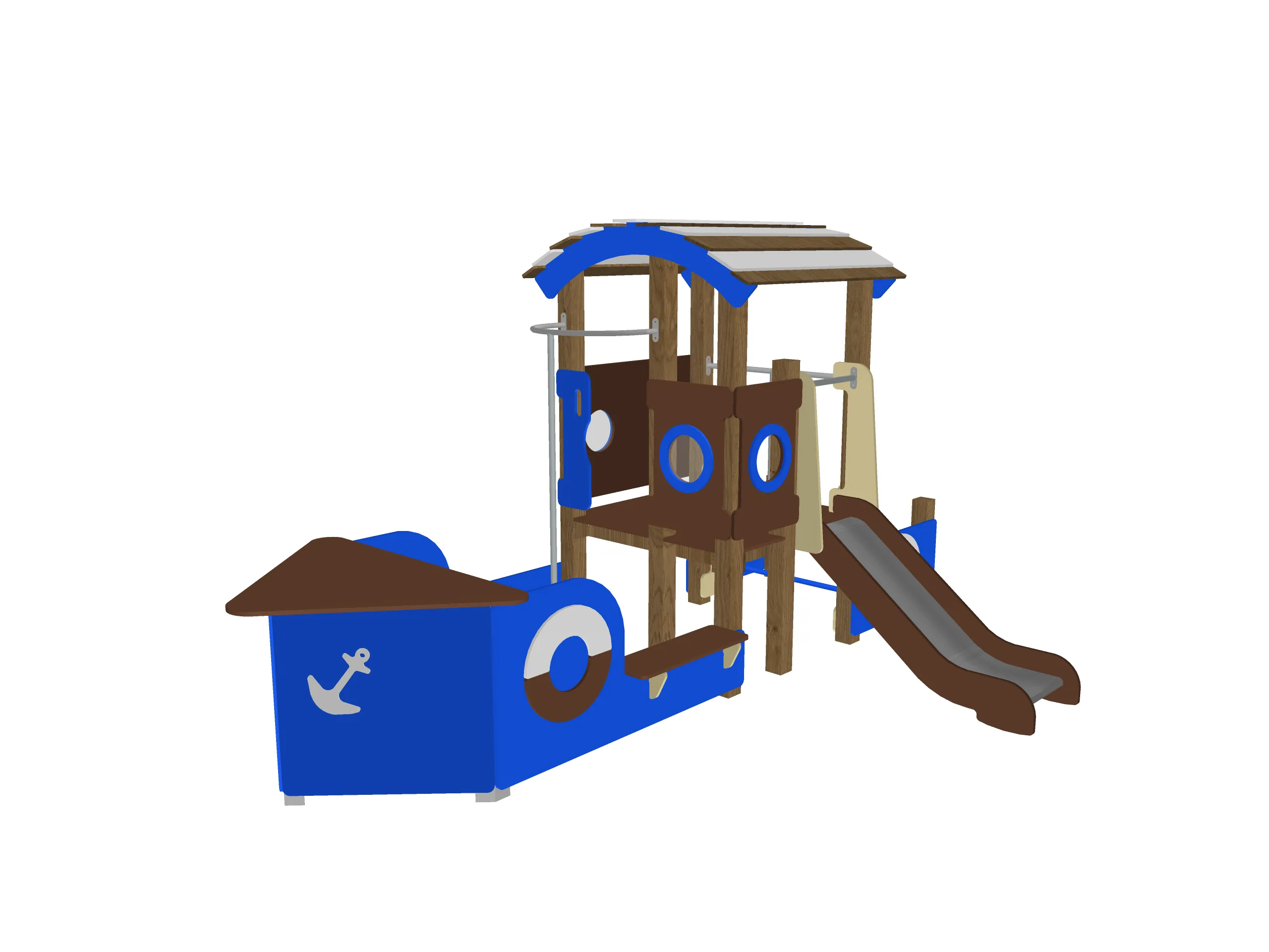 Игровой комплекс в форме корабля для малышей: деревянная конструкция с капитанской рубкой, лестницей, переходной платформой и горкой. Корабль с якорём, иллюминаторами и декоративными элементами. Подходит для лазания, спуска и ролевых морских приключений.