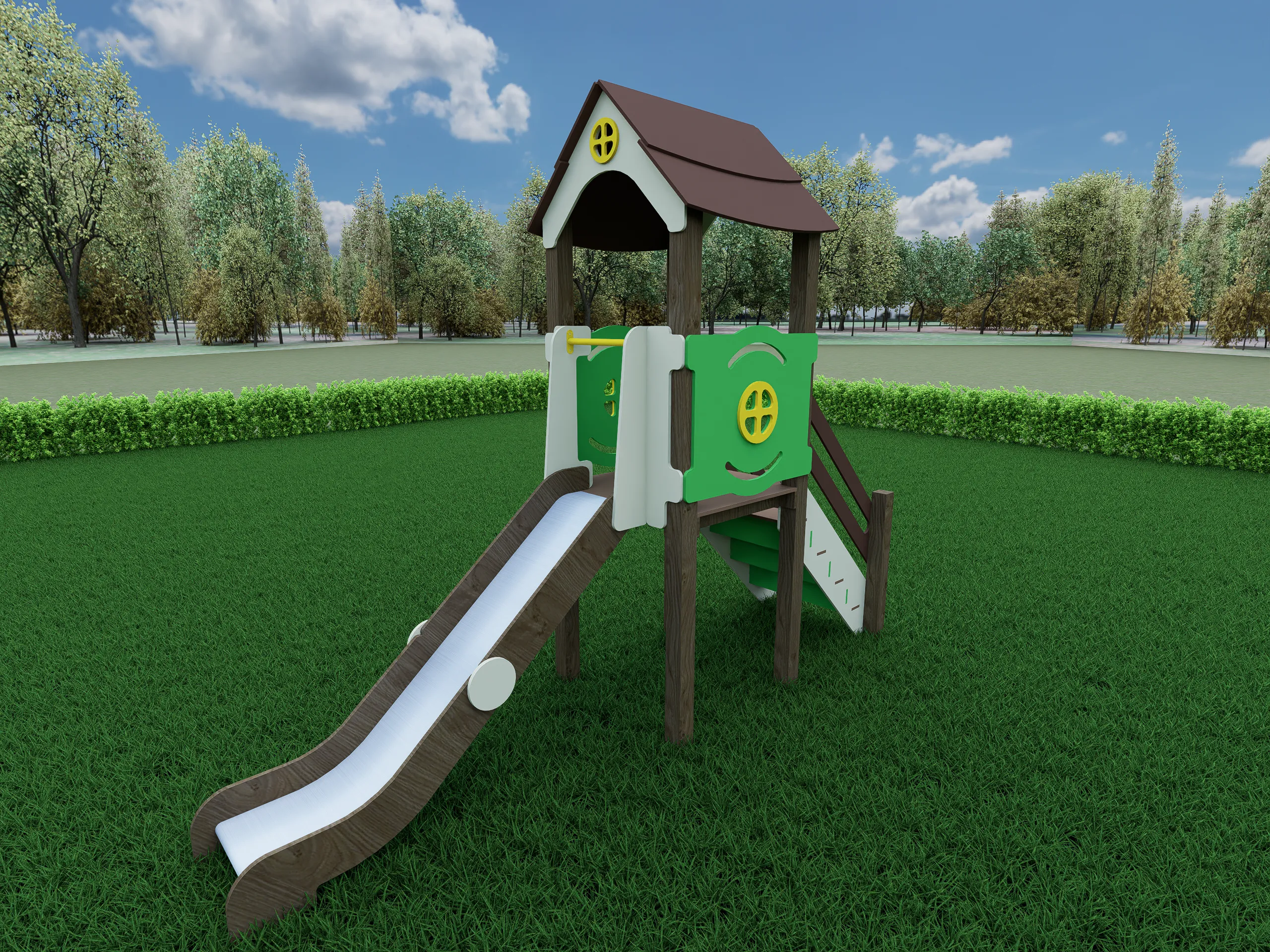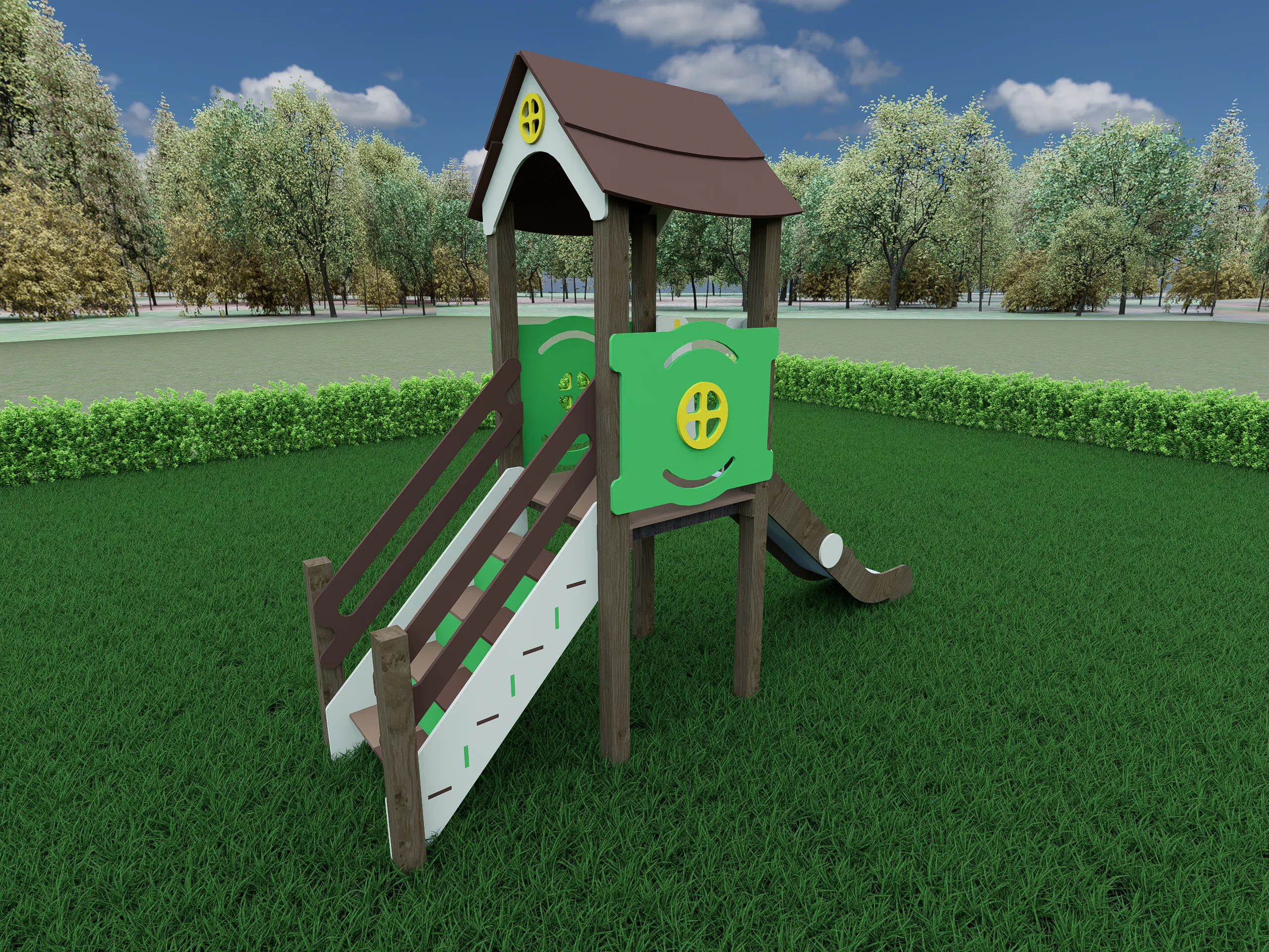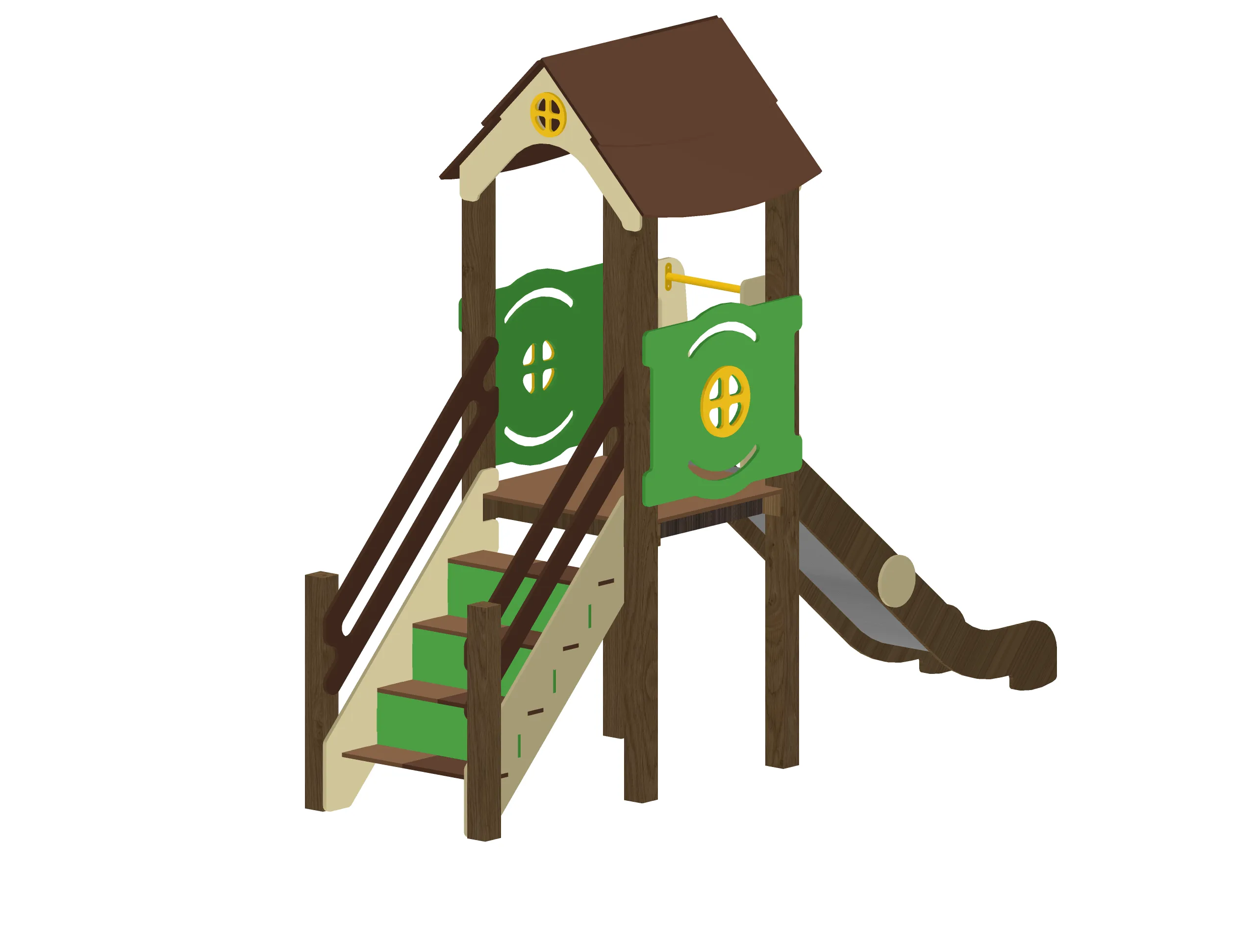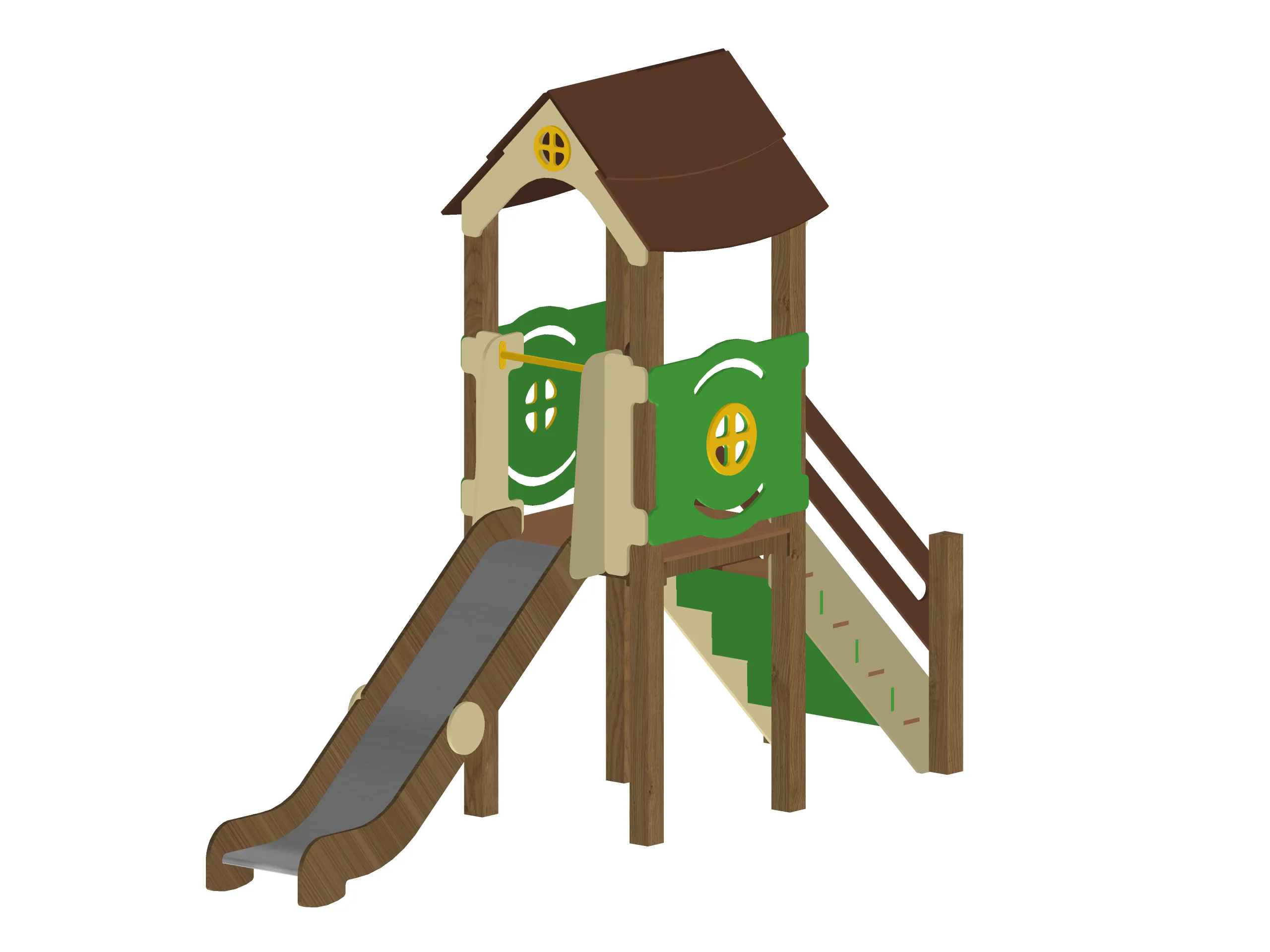 Компактный игровой комплекс с башней под крышей, оформленный в виде уютного домика. Оснащён удобной лестницей с поручнями и безопасной горкой с плавным спуском. Декоративные панели с окошками создают привлекательный внешний вид и подходят для сюжетных игр. Конструкция способствует развитию координации, воображения и активного движения. Надёжные материалы обеспечивают устойчивость и долговечность при эксплуатации на улице.