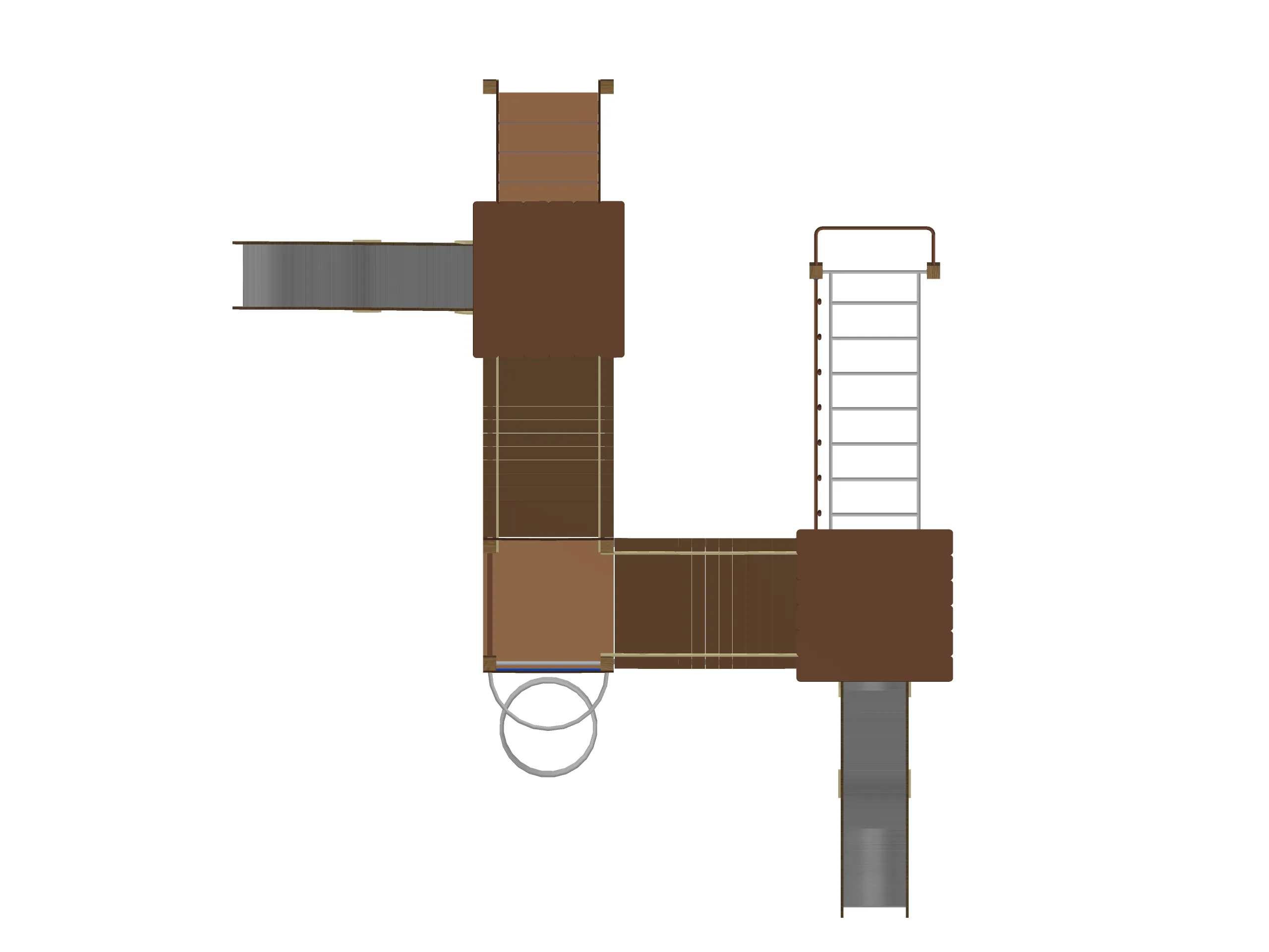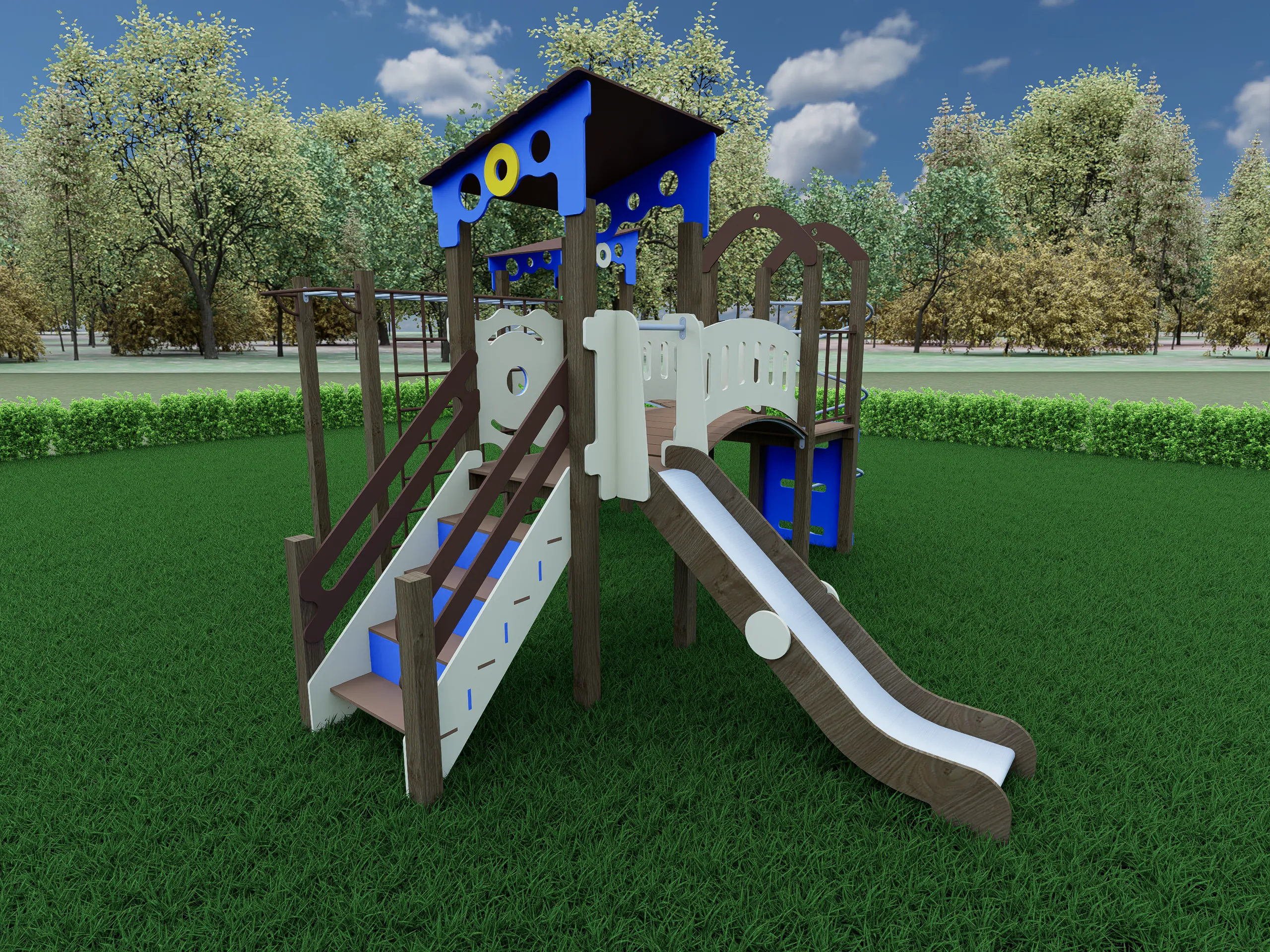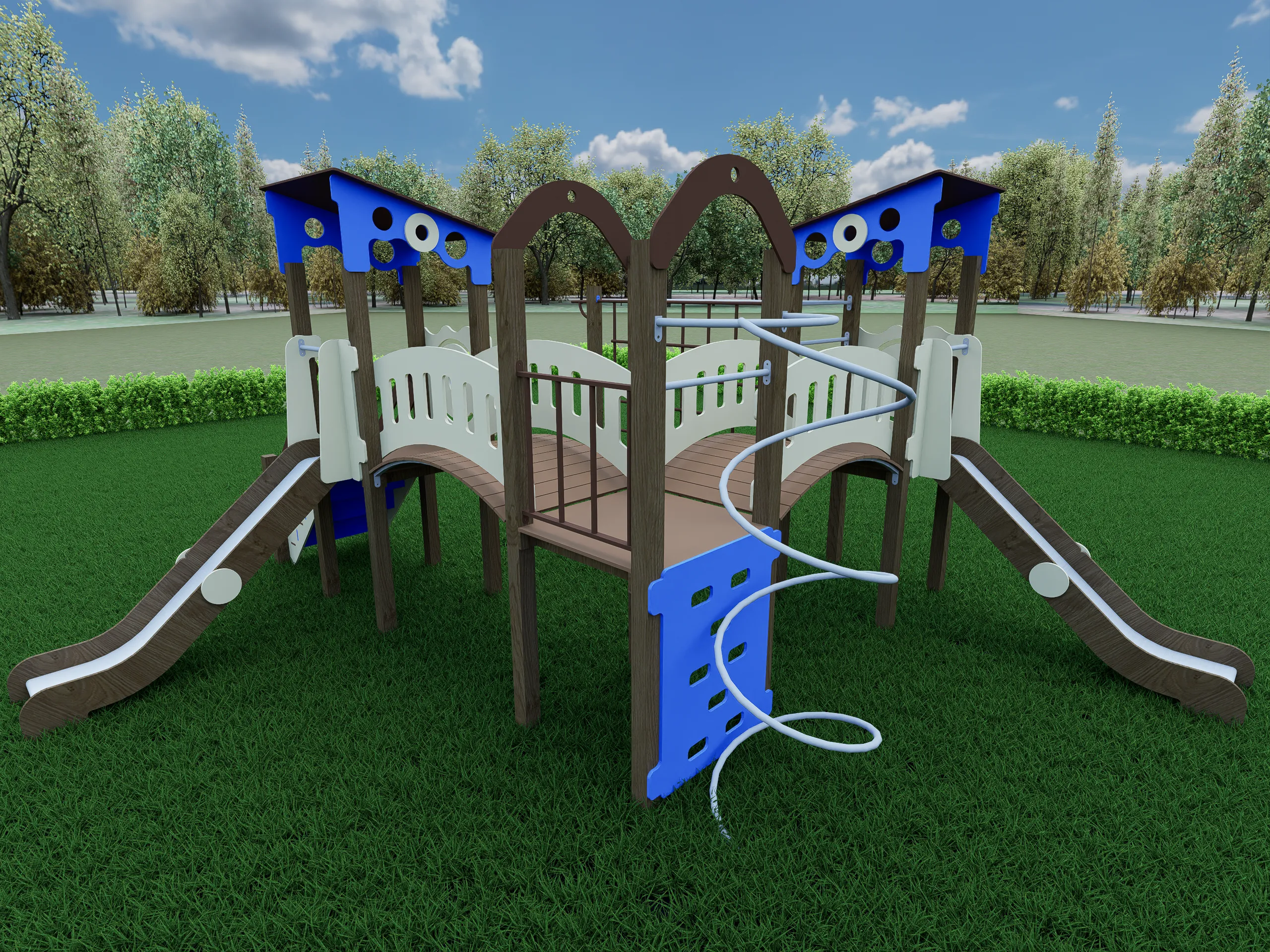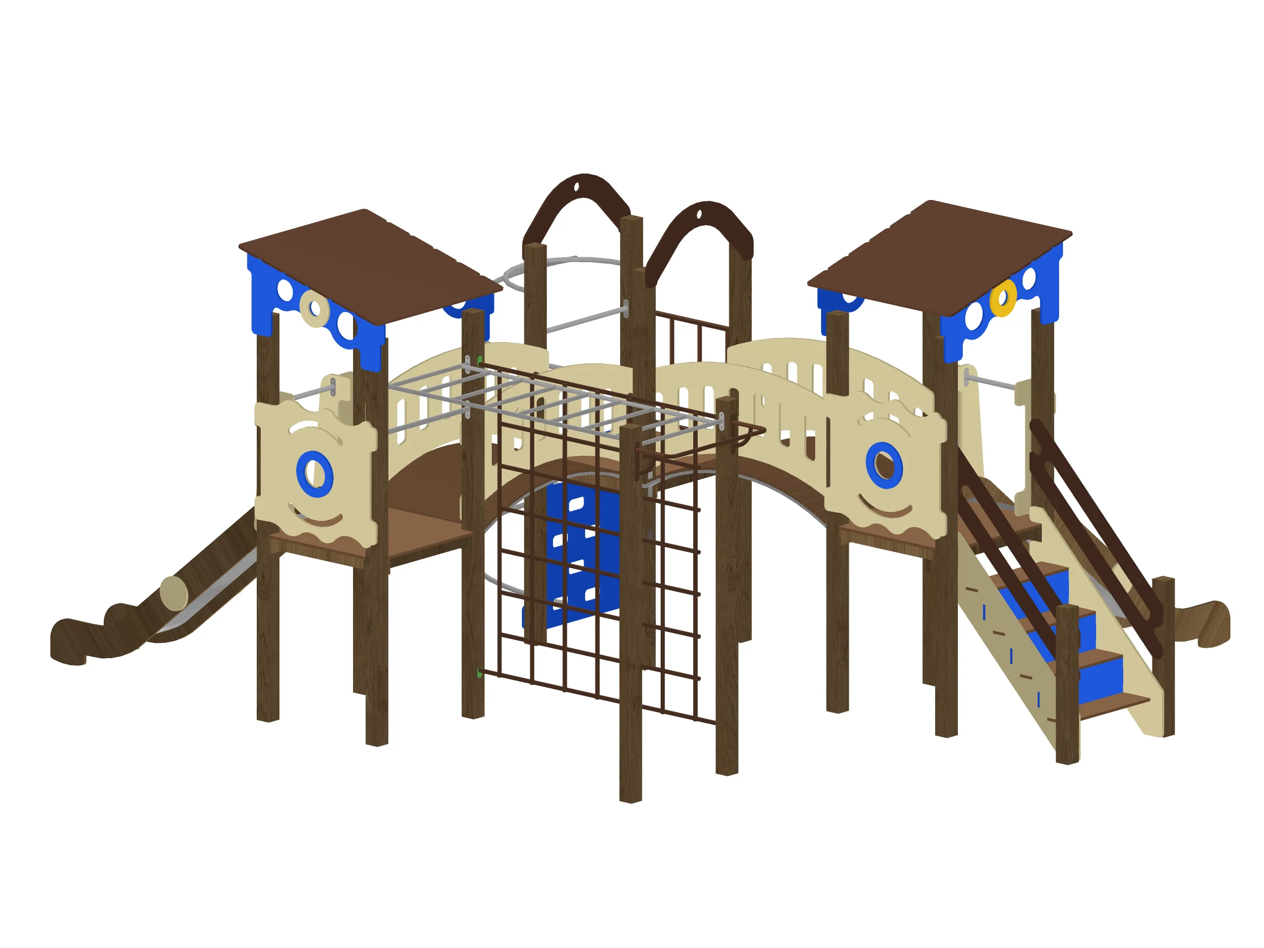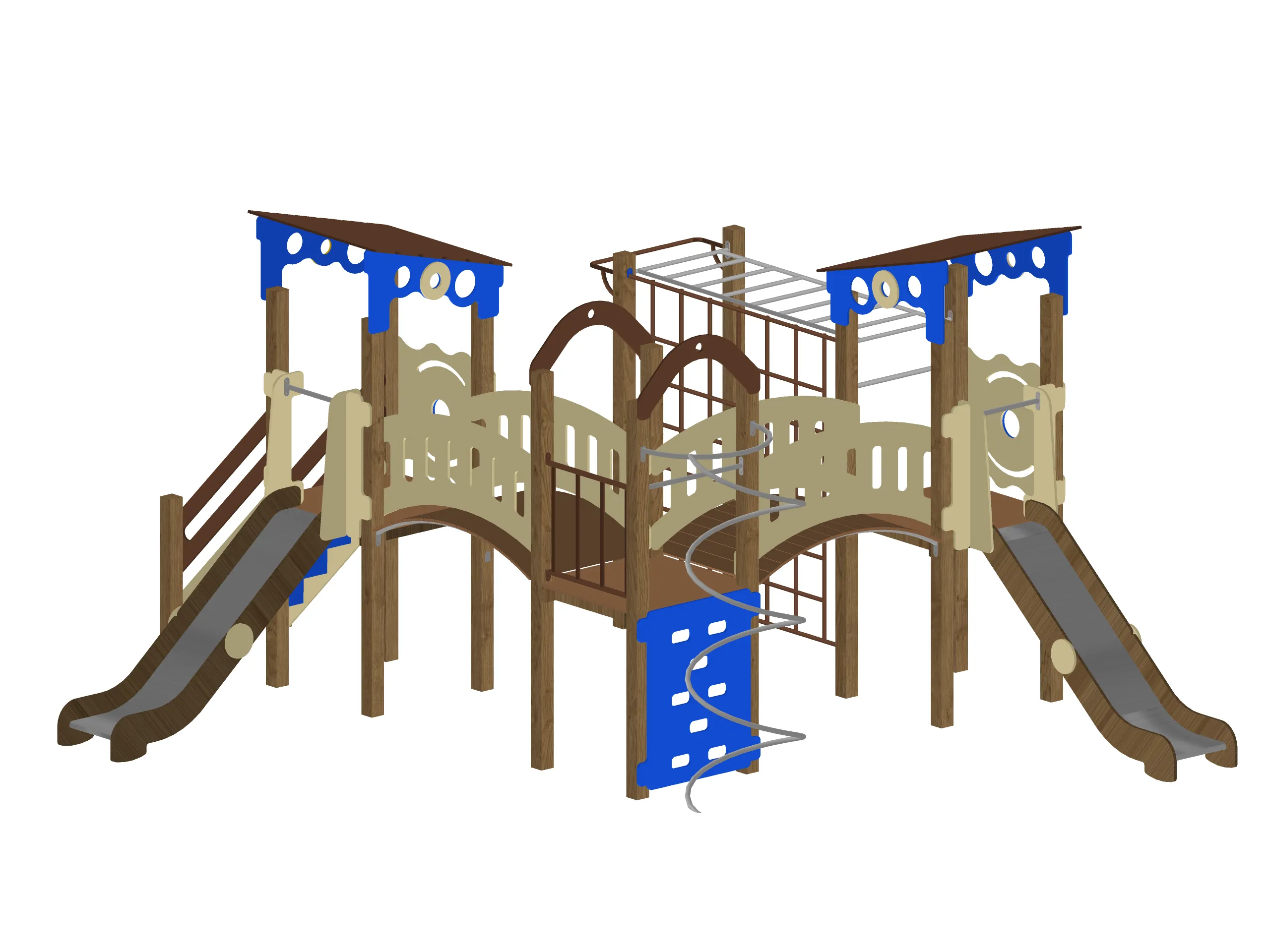 Просторный игровой комплекс с двумя домиками под крышами, соединёнными изогнутыми переходными мостиками. Конструкция включает две горки, лестницы с перилами, рукоход, вертикальную лазательную решётку и спиральный элемент для подъёма.