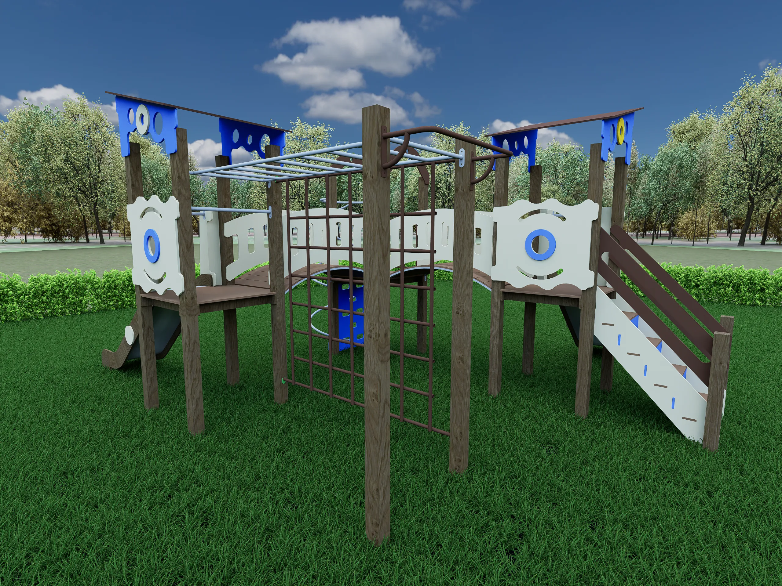 Многоуровневая компоновка создаёт разнообразные игровые маршруты и позволяет детям активно двигаться, развивая координацию и ловкость. Комплекс рассчитан на одновременную игру нескольких детей и подходит для размещения на открытых площадках различного формата.