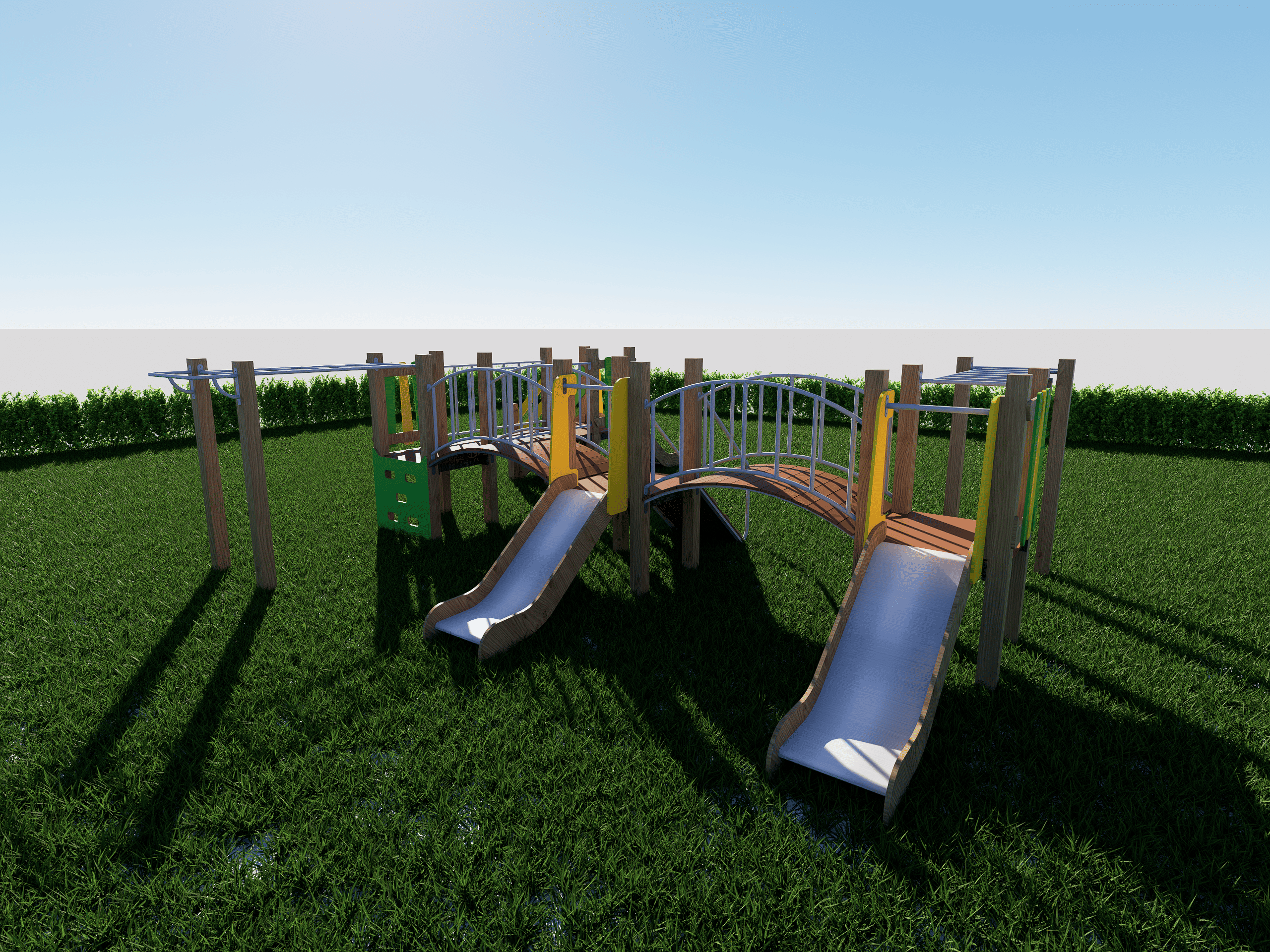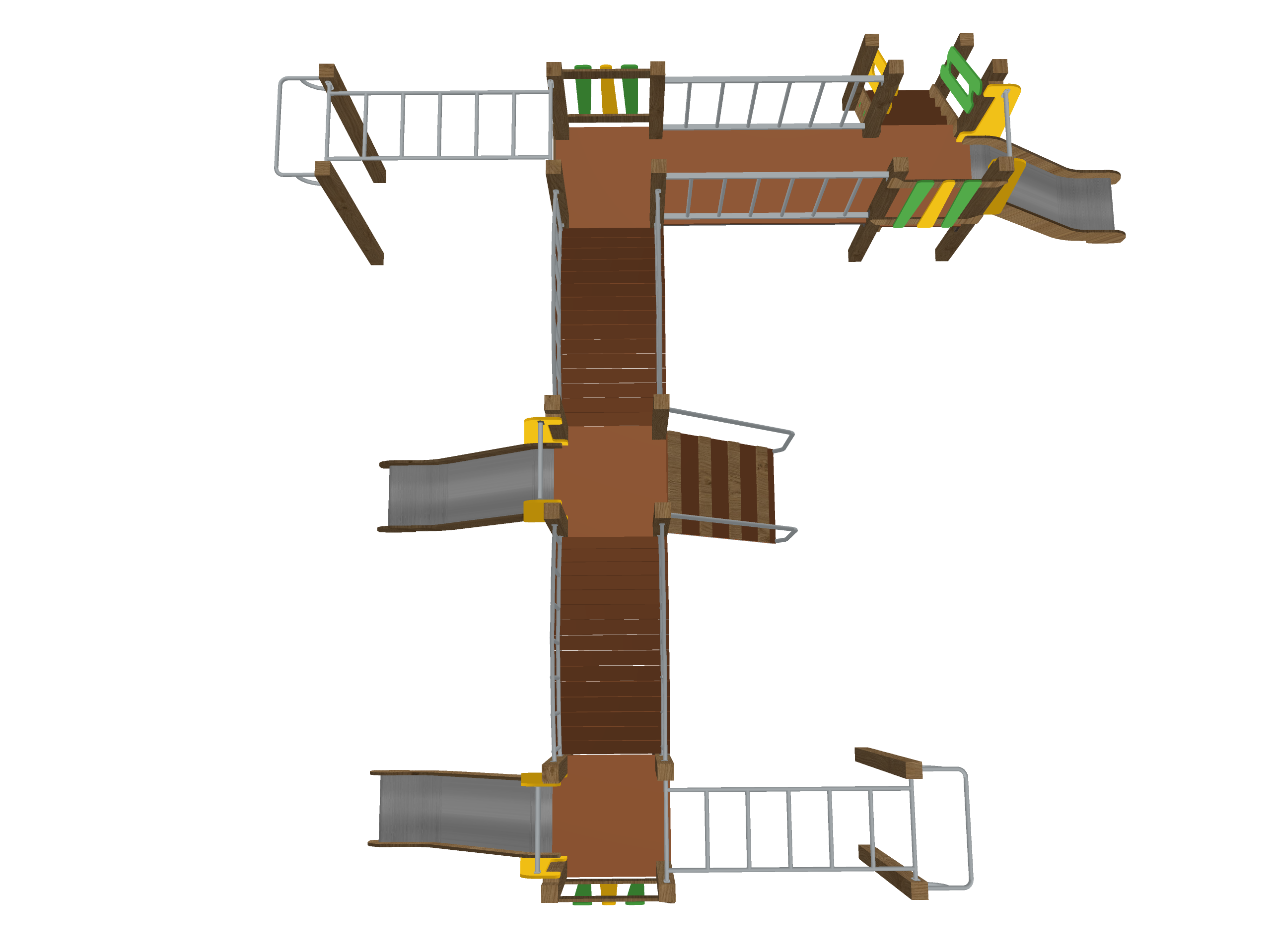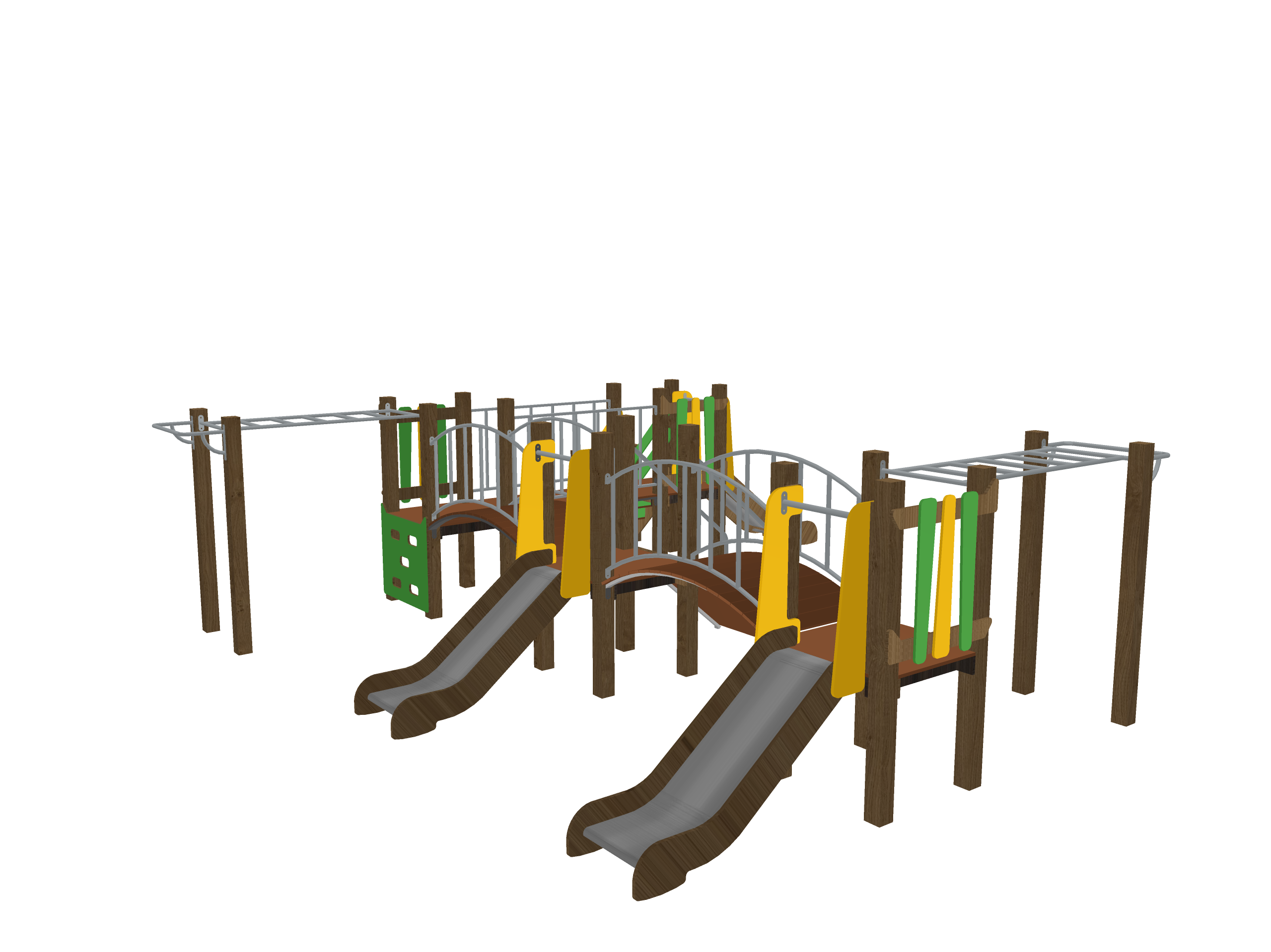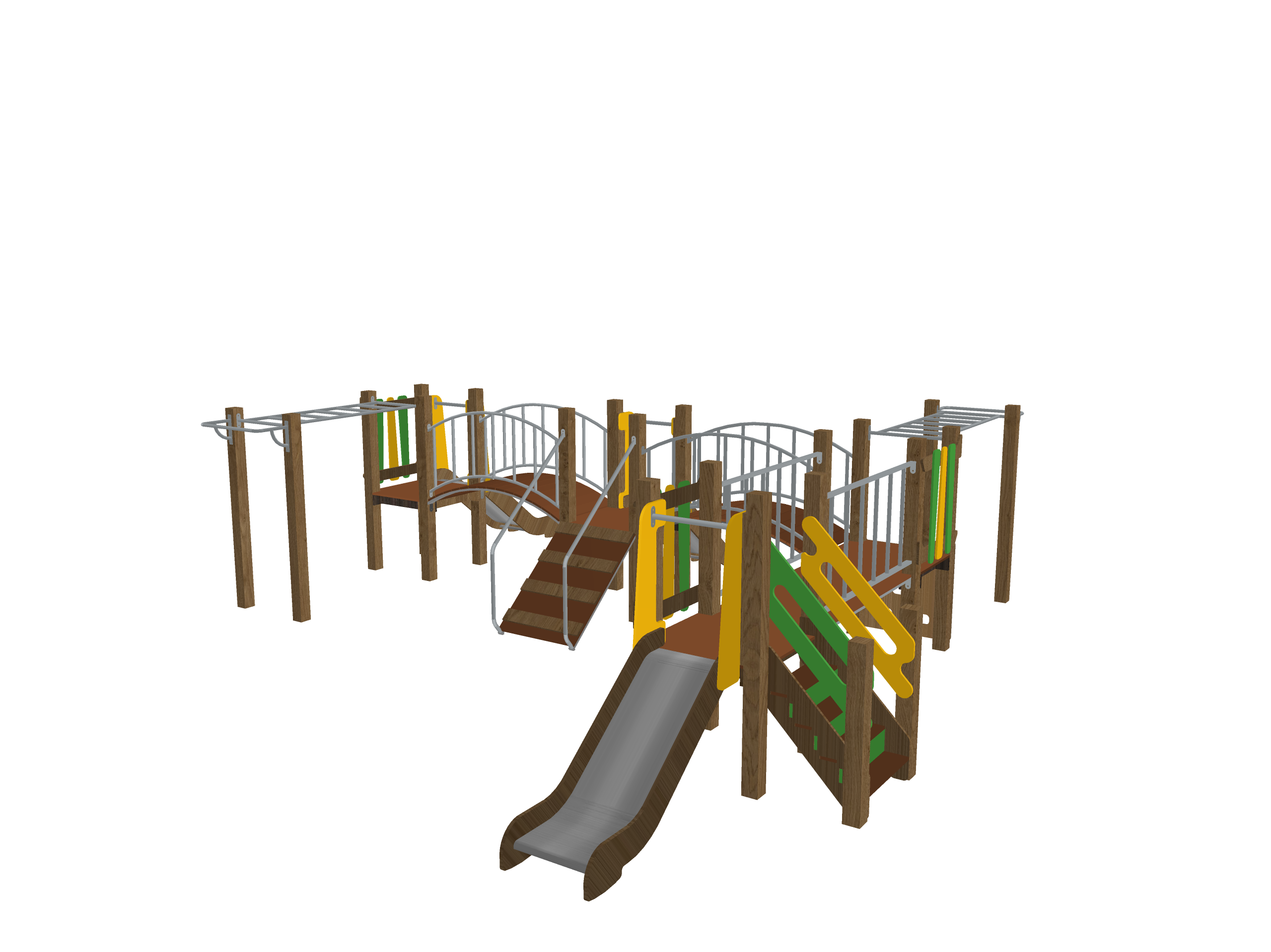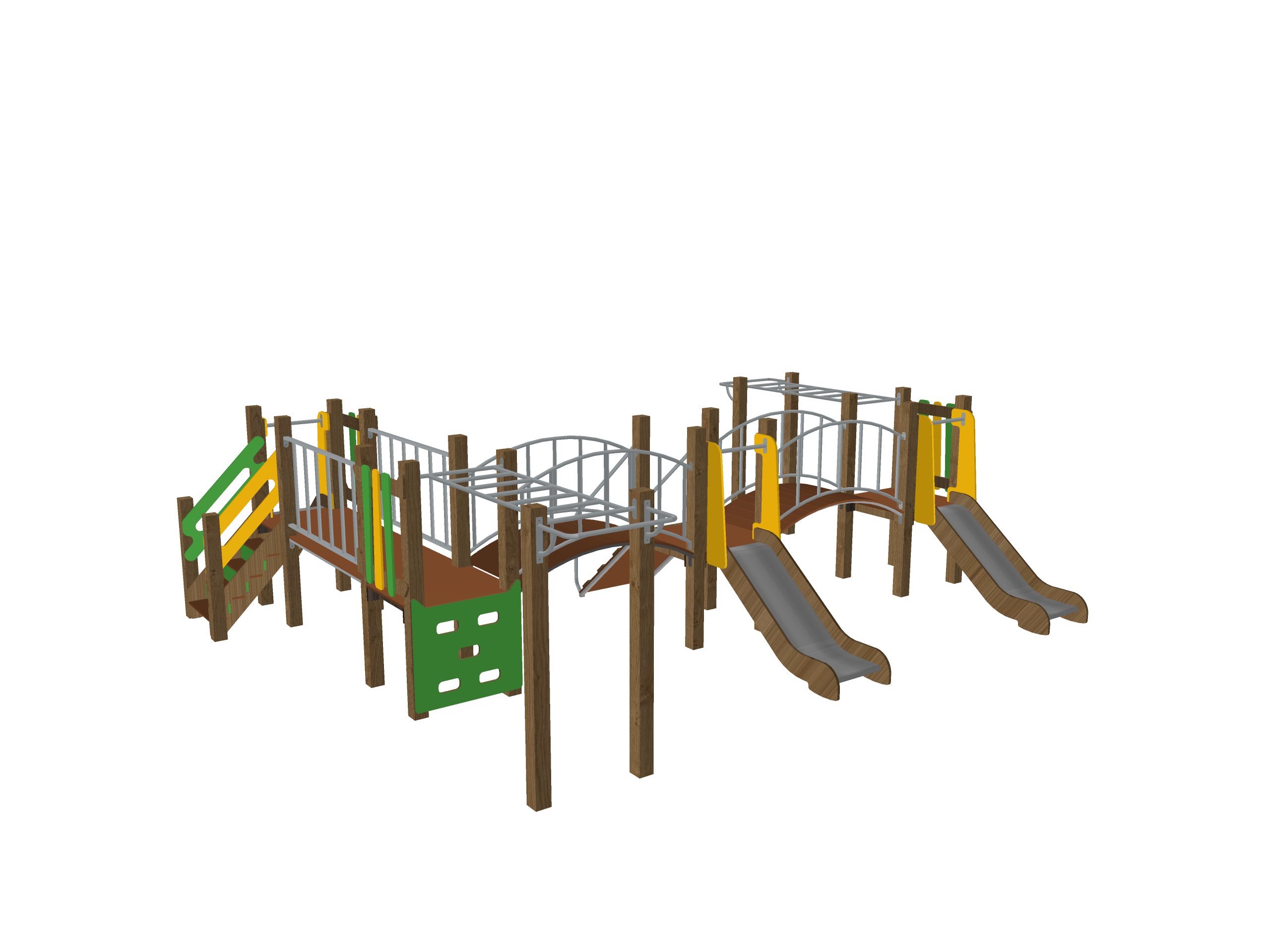 Современный многофункциональный игровой комплекс с акцентом на высокую активность и разнообразие маршрутов. Включает более семи переходных элементов (мостики, сетки, дуговые поручни), две горки и систему многоуровневых платформ. Материалы — обработанная древесина и сталь — обеспечивают долговечность и соответствие актуальным нормам безопасности. Идеально подходит для дворов жилых комплексов, школ и парков.