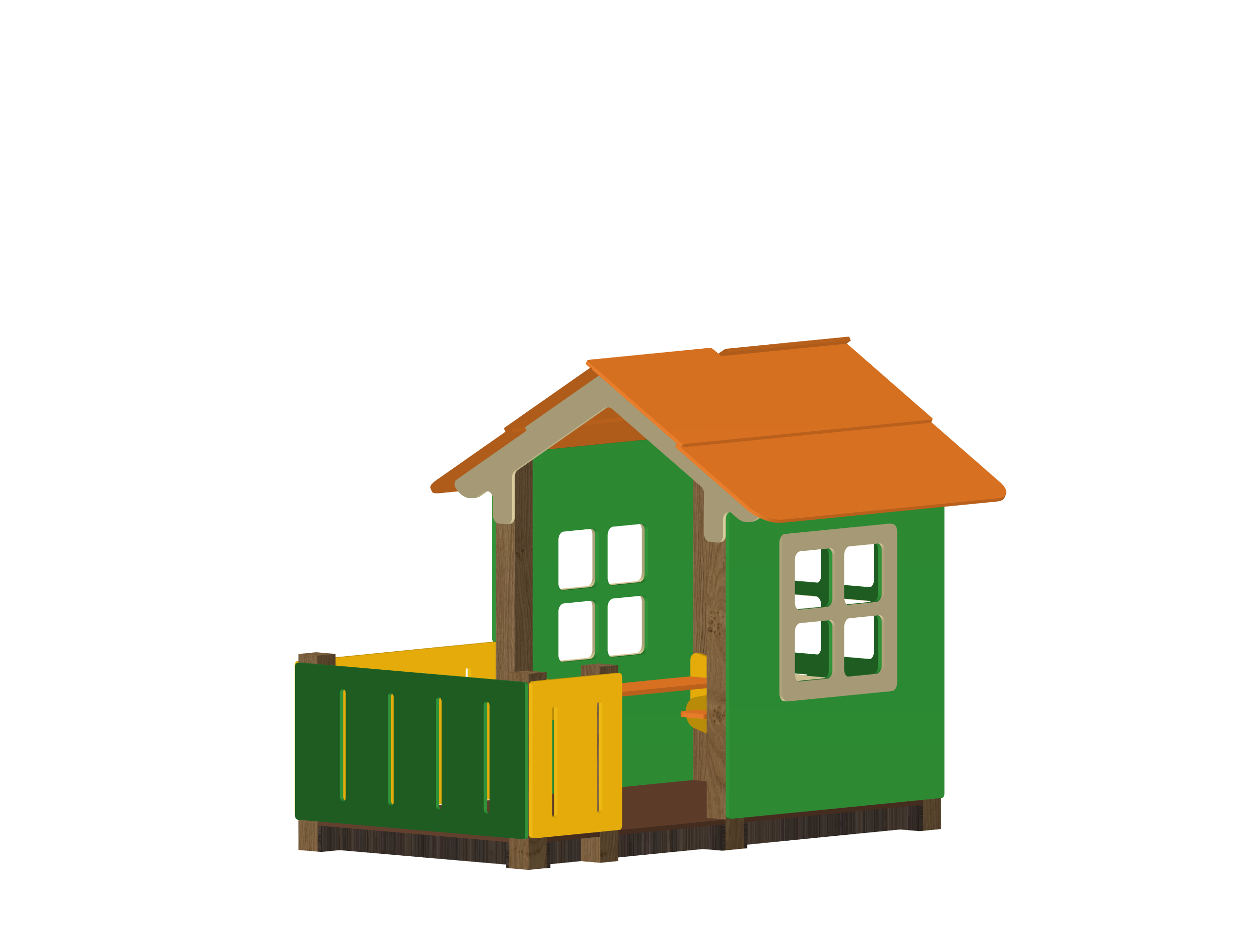 Крыша оранжевого цвета с плавными скатами, просторный вход-арка, внутри удобная скамеечка для отдыха, боковые стенки украшены квадратными окошками и вертикальными яркими полосками. Пристроенный открытый «дворик» с невысоким заборчиком создаёт ощущение собственного маленького садика. Конструкция низкая, устойчивая, с гладкими краями и полностью соответствует современным стандартам безопасности.