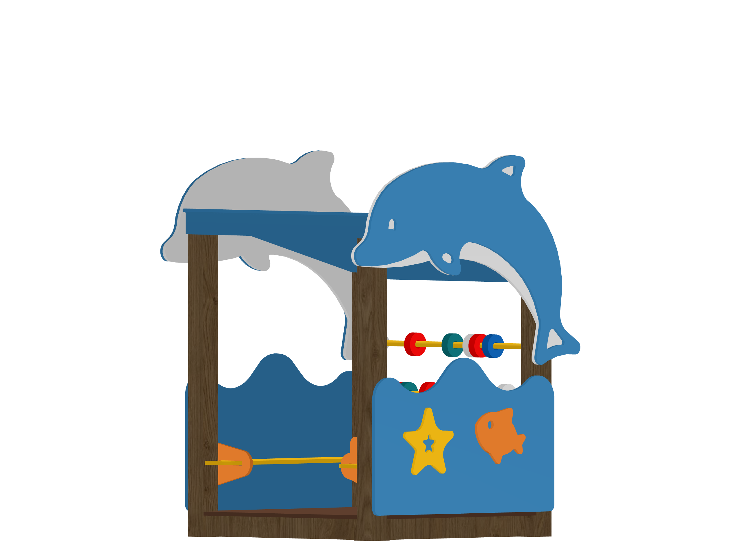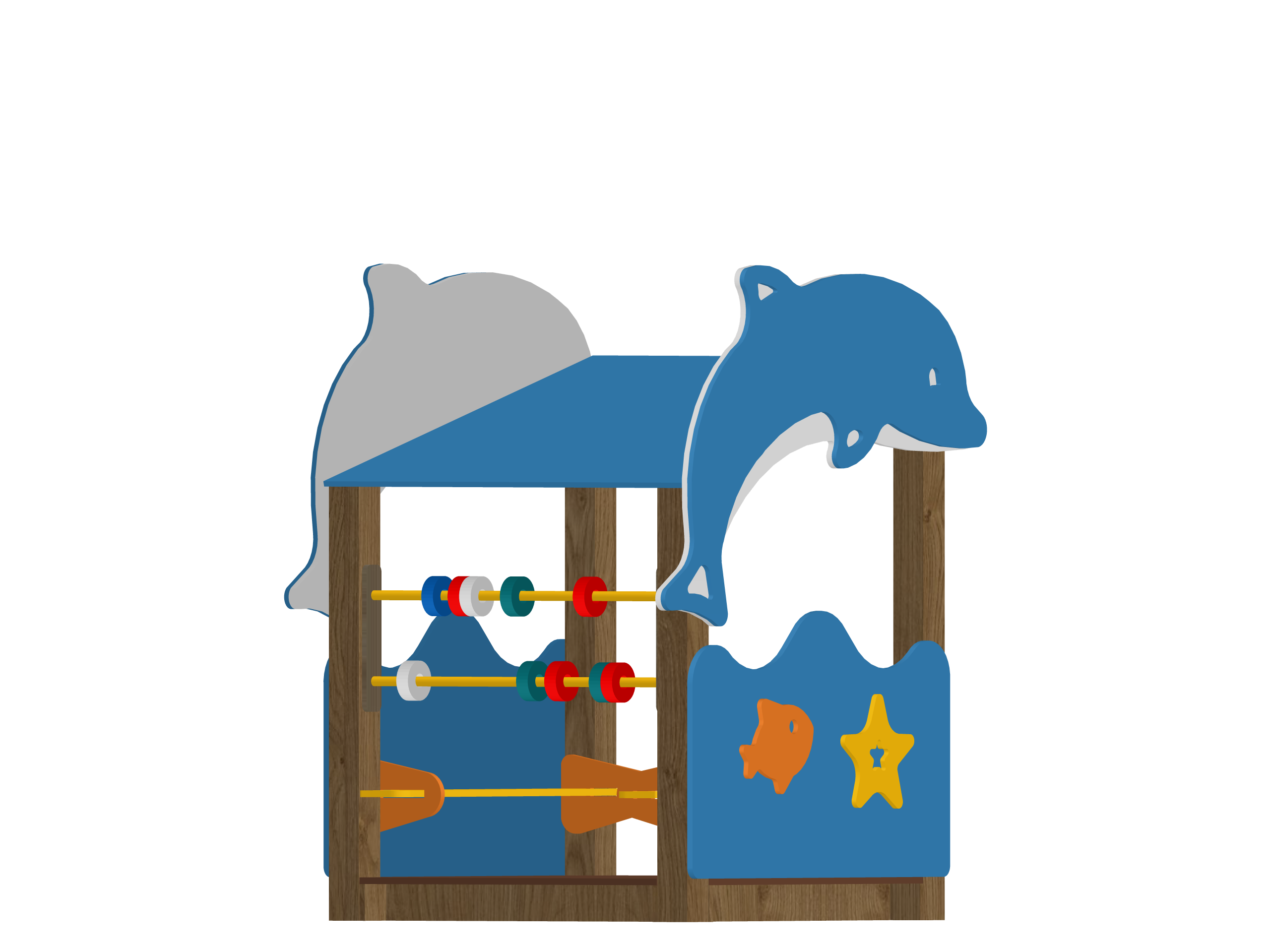 Открытая рама с двумя прыгающими дельфинами (серый и синий) над крышей, в центре — двухрядный счётник с разноцветными большими бусинами для перекатывания. Боковые панели оформлены волнами, рыбкой и звездой, создавая атмосферу подводного мира. Все элементы закруглённые, на удобной высоте, конструкция устойчивая и полностью соответствует современным стандартам безопасности.