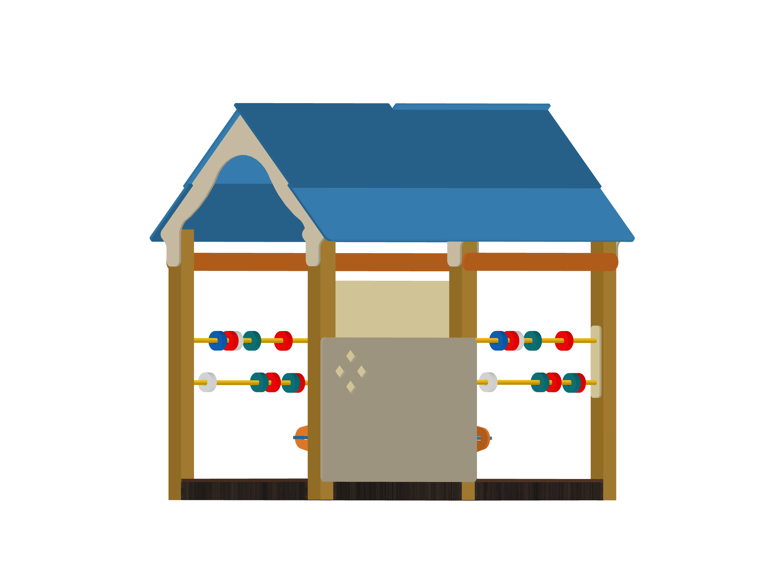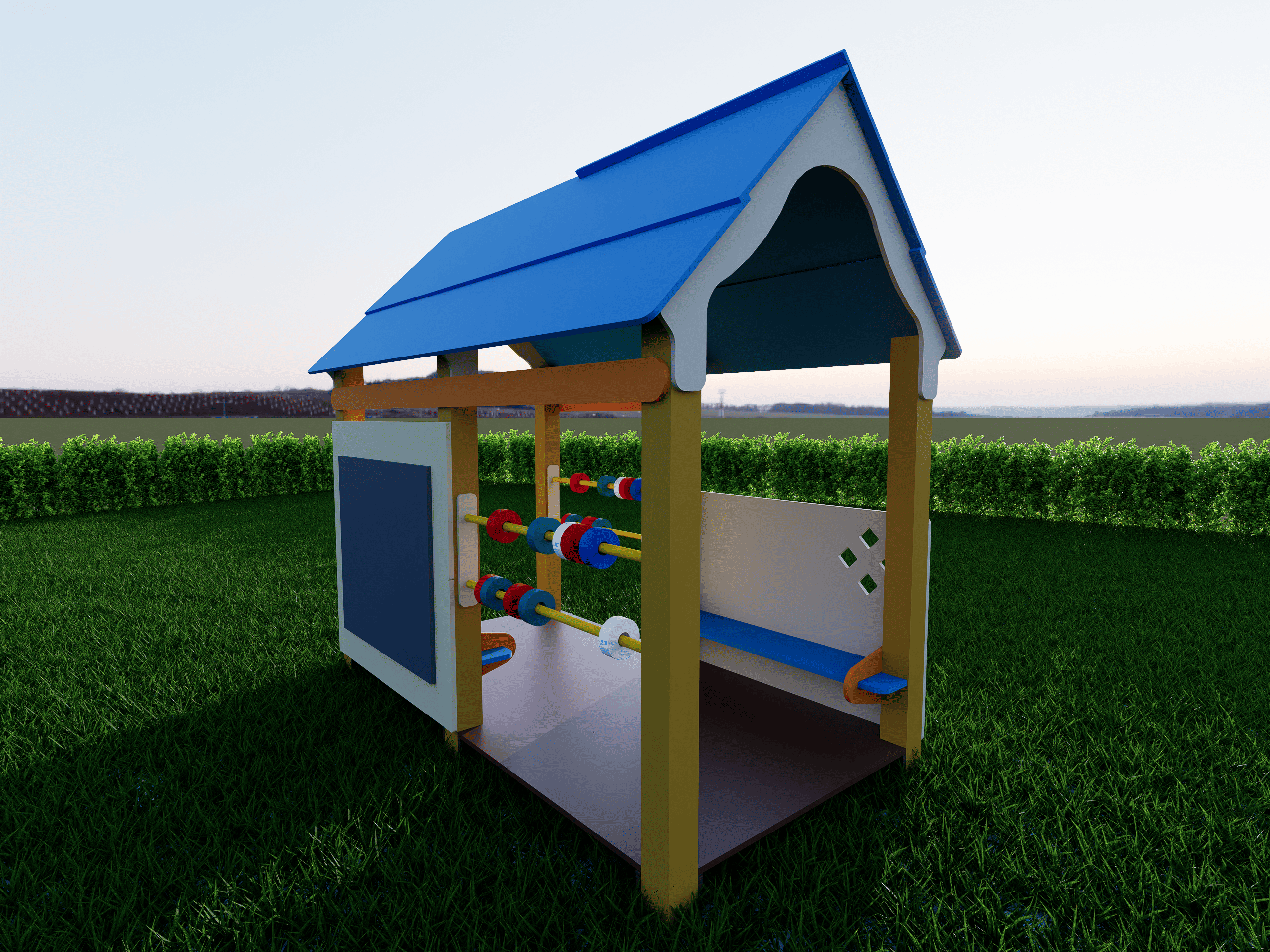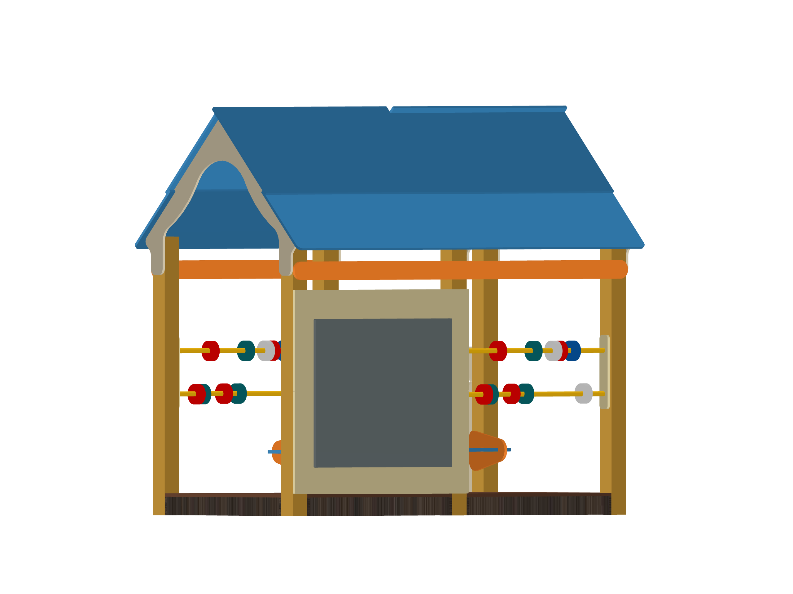 Крыша синего цвета с плавными скатами, открытая рама с удобной доской для рисования мелом в центре, слева и справа — двухрядные счётники с разноцветными бусинами на жёлтых стержнях. Конструкция низкая, устойчивая, с закруглёнными краями и полностью соответствует современным стандартам безопасности.