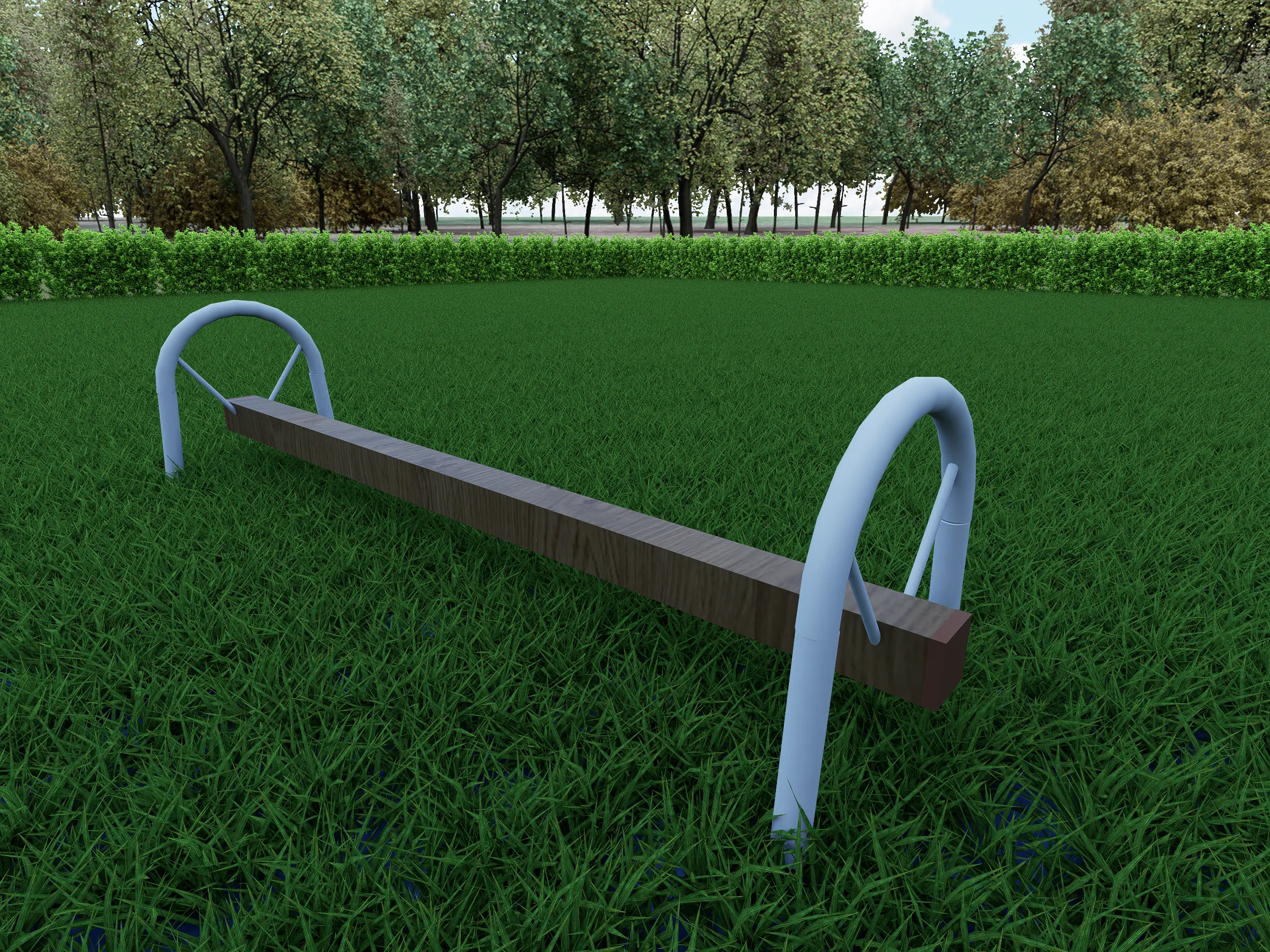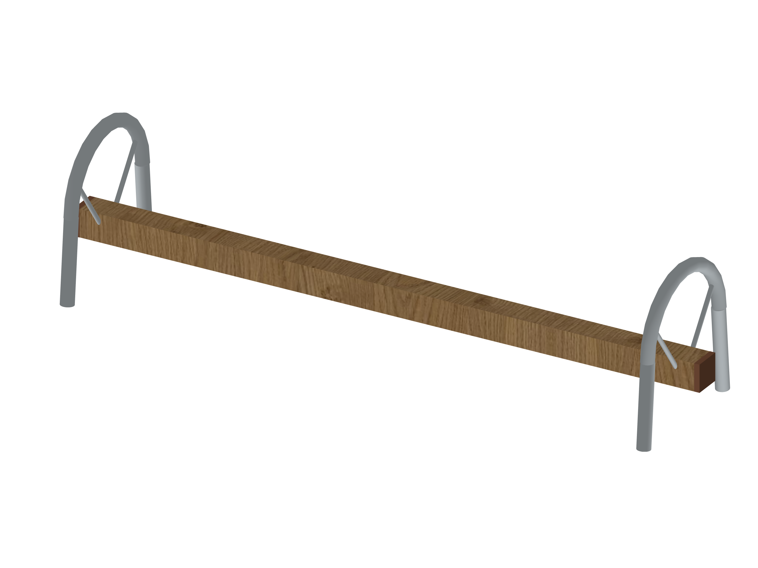 Балансировочное бревно для детской площадки: длинная деревянная перекладина прямоугольного сечения на двух металлических дугообразных опорах серого цвета. Конструкция для развития равновесия и координации, материал — натуральное дерево с коричневым покрытием.