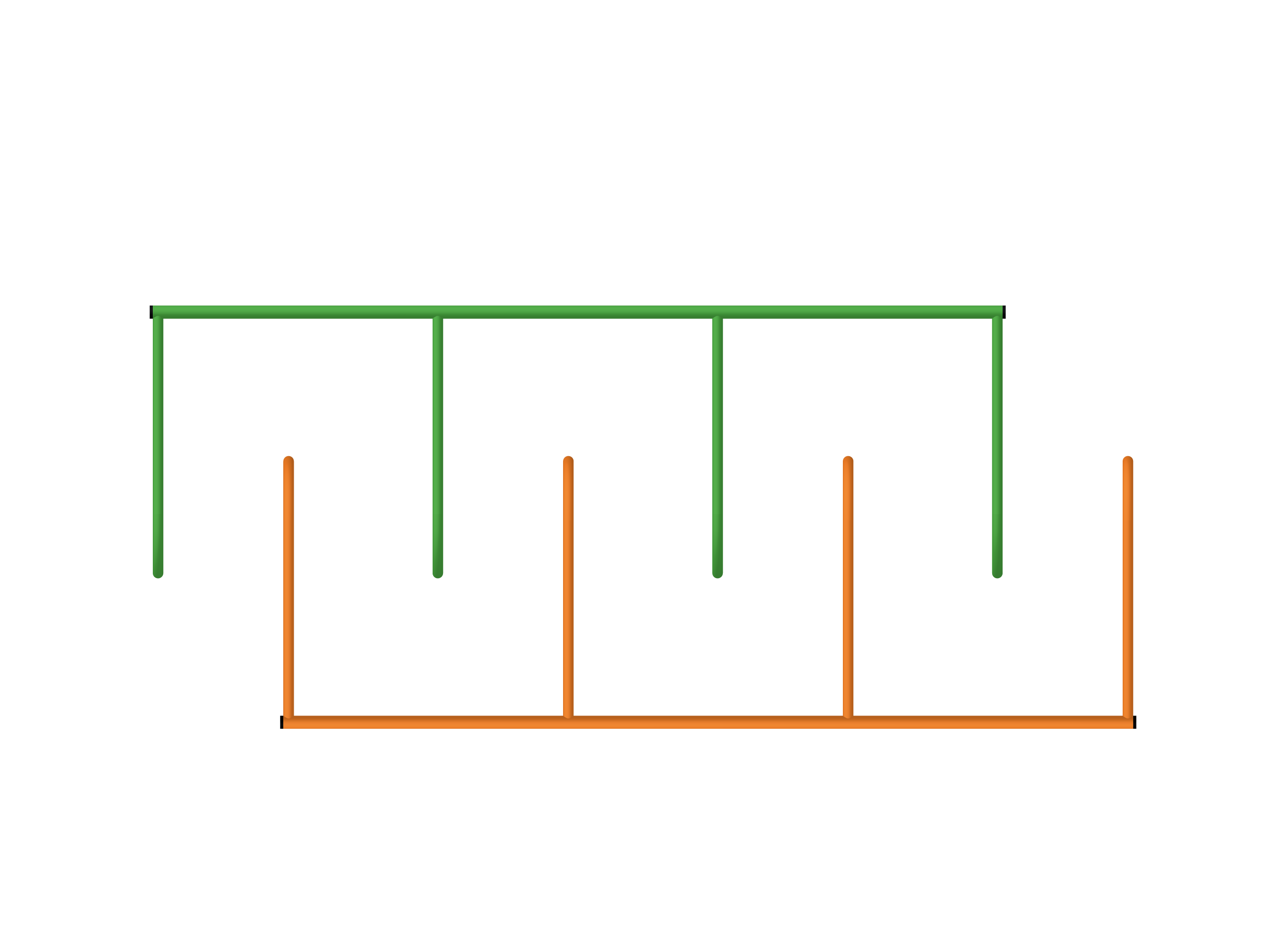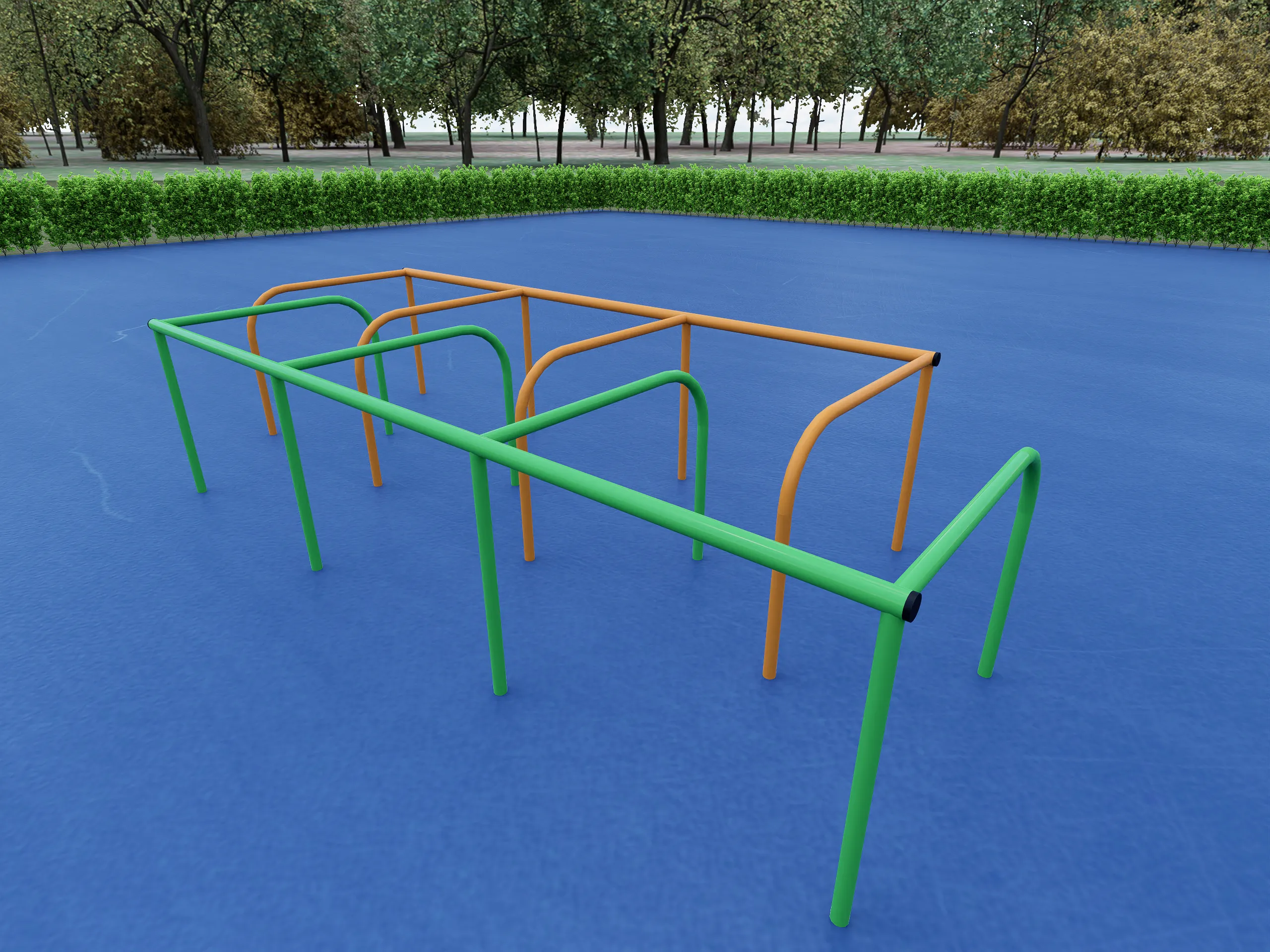 Лазательный комплекс / лабиринт для детской площадки: металлическая конструкция из оранжевых и зелёных труб. Прямоугольная рама с тремя параллельными перекладинами и дугообразными опорами, образующими три секции для лазания и подтягивания.