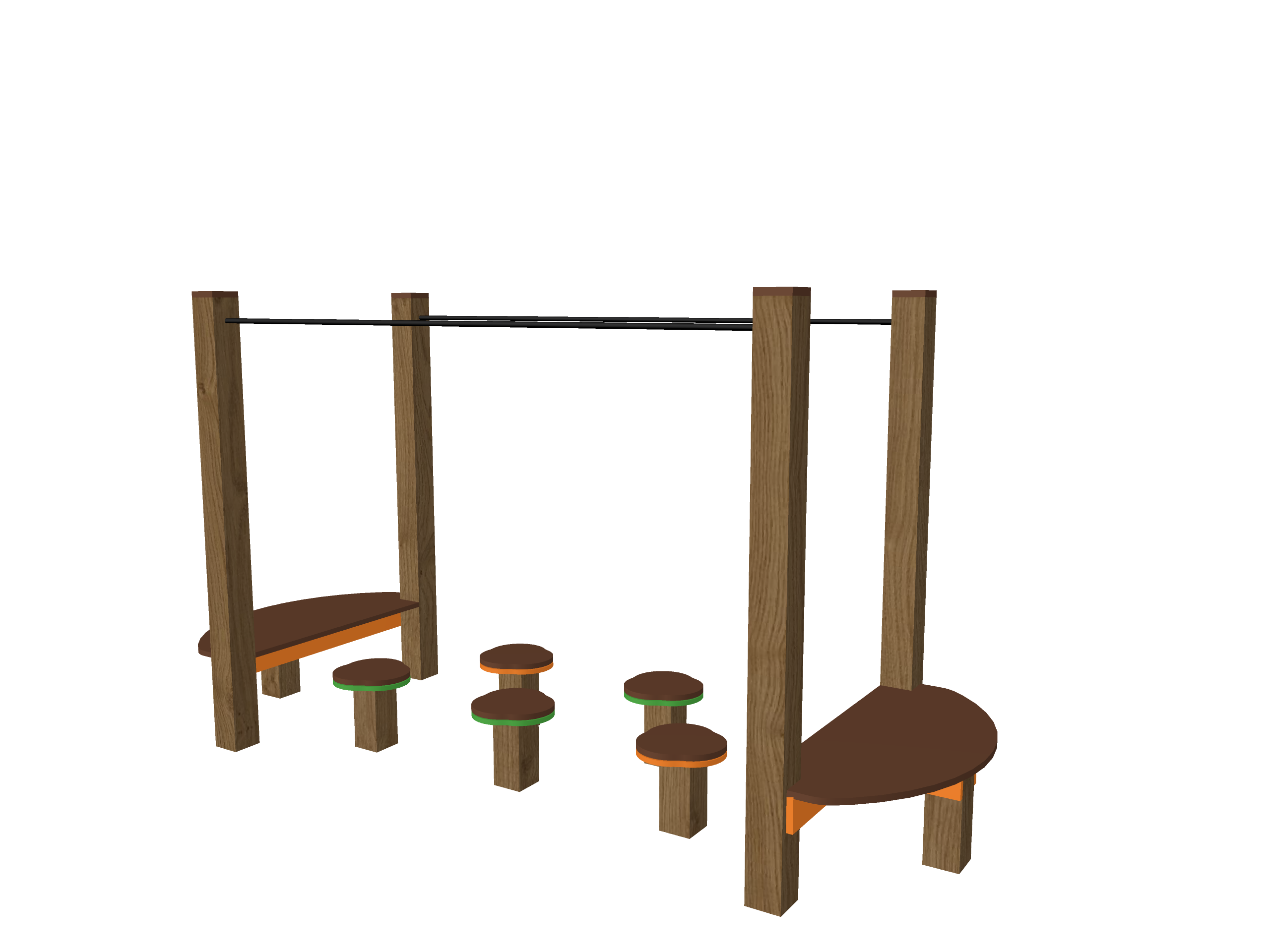 Переходной мостик для детской площадки: деревянная конструкция с высокой горизонтальной перекладиной, двумя полукруглыми платформами по бокам и четырьмя круглыми ступенями/опорами разной высоты в центре для перехода и баланса. Материал — дерево, цвета: коричневый, оранжевые акценты, зелёные окантовки.