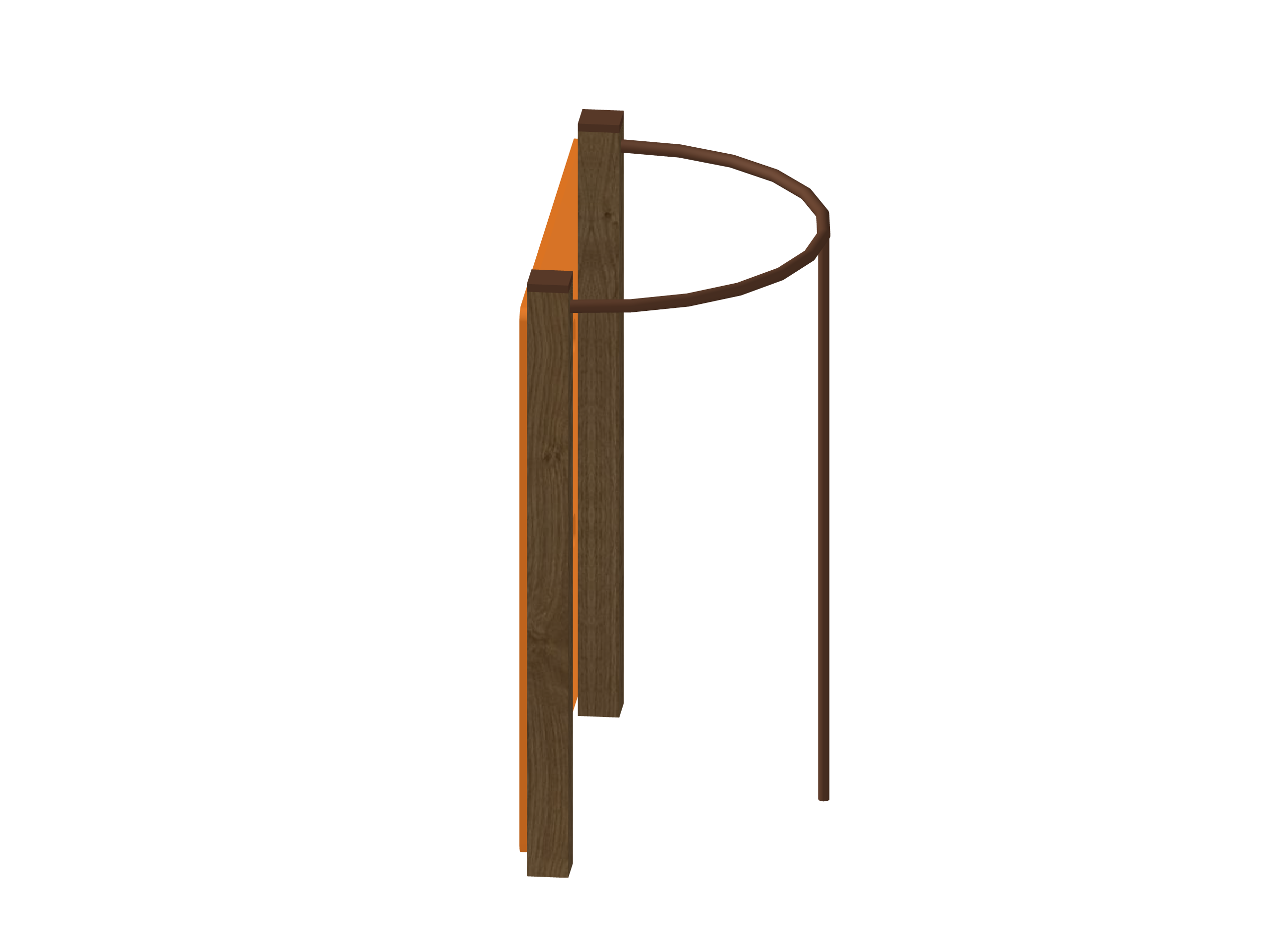 Устойчивая рама с горизонтальными перекладинами, центральная оранжевая панель с отверстиями для рук и ног. Все края тщательно закруглены, конструкция низкая, с широкой базой и полностью соответствует современным стандартам безопасности.