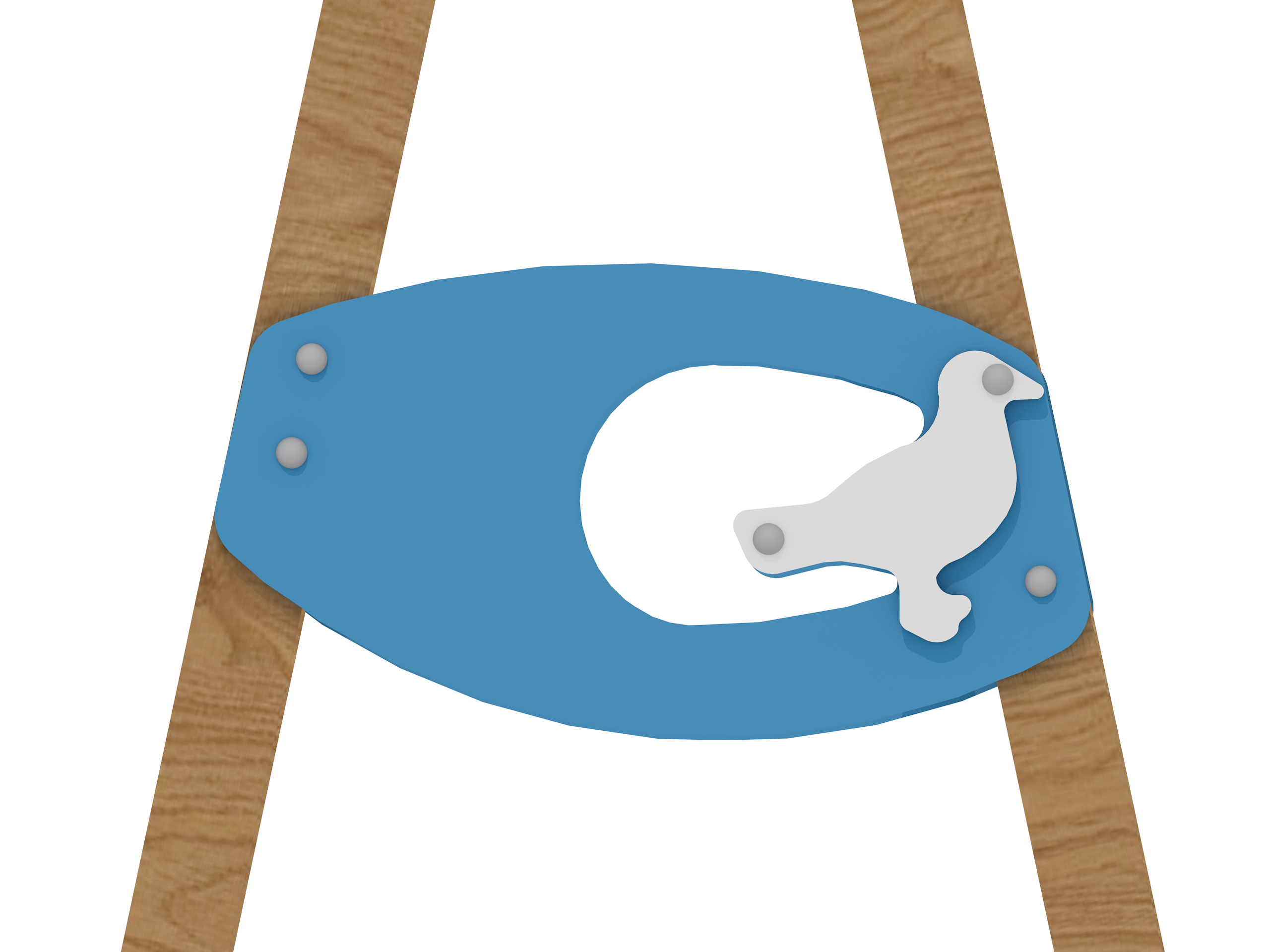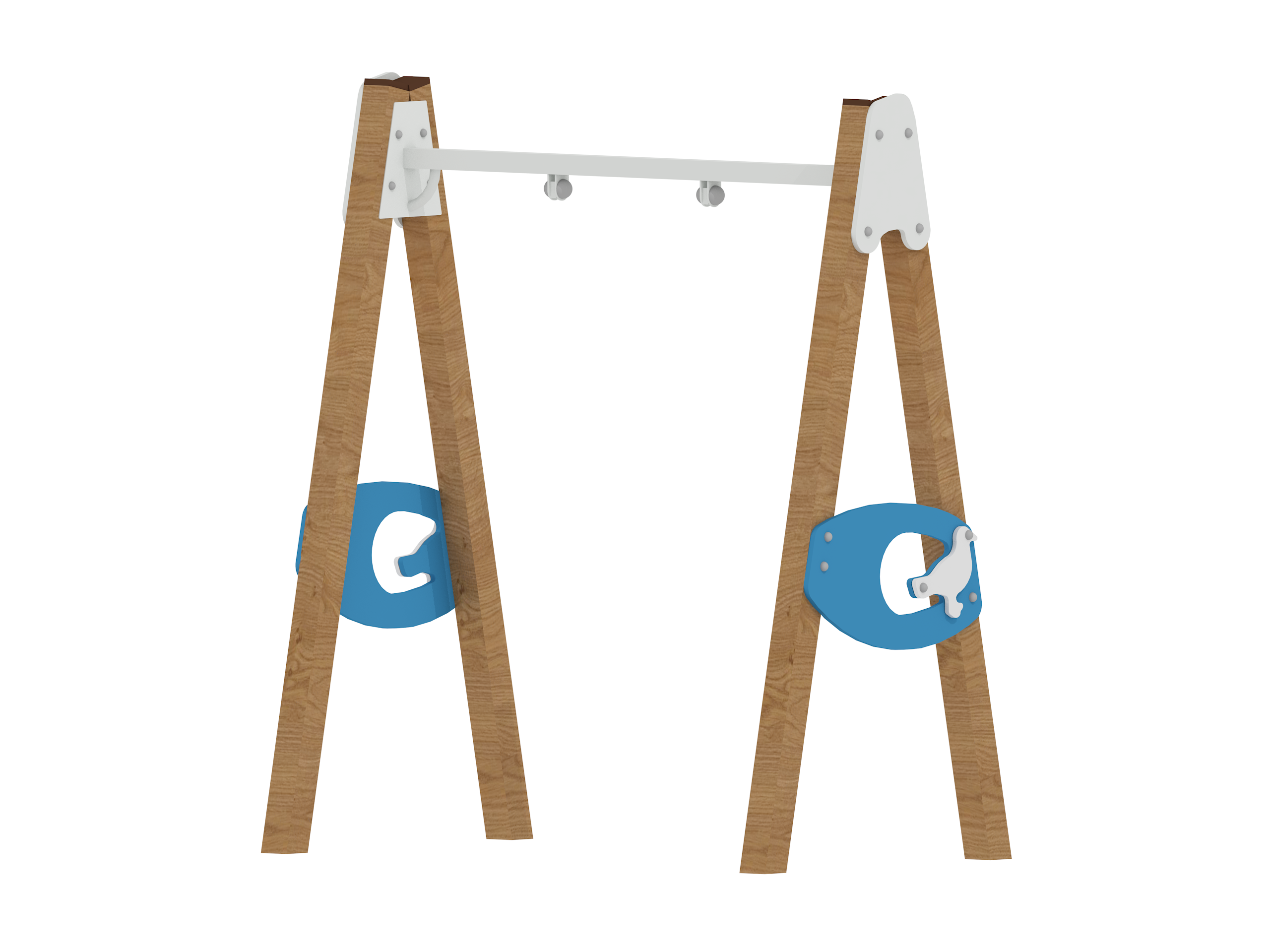Простая и очаровательная подвесная качель для малышей с комбинированной конструкцией: брус 100×100 мм в пропитке + крашеная фанера + металлическая перекладина.