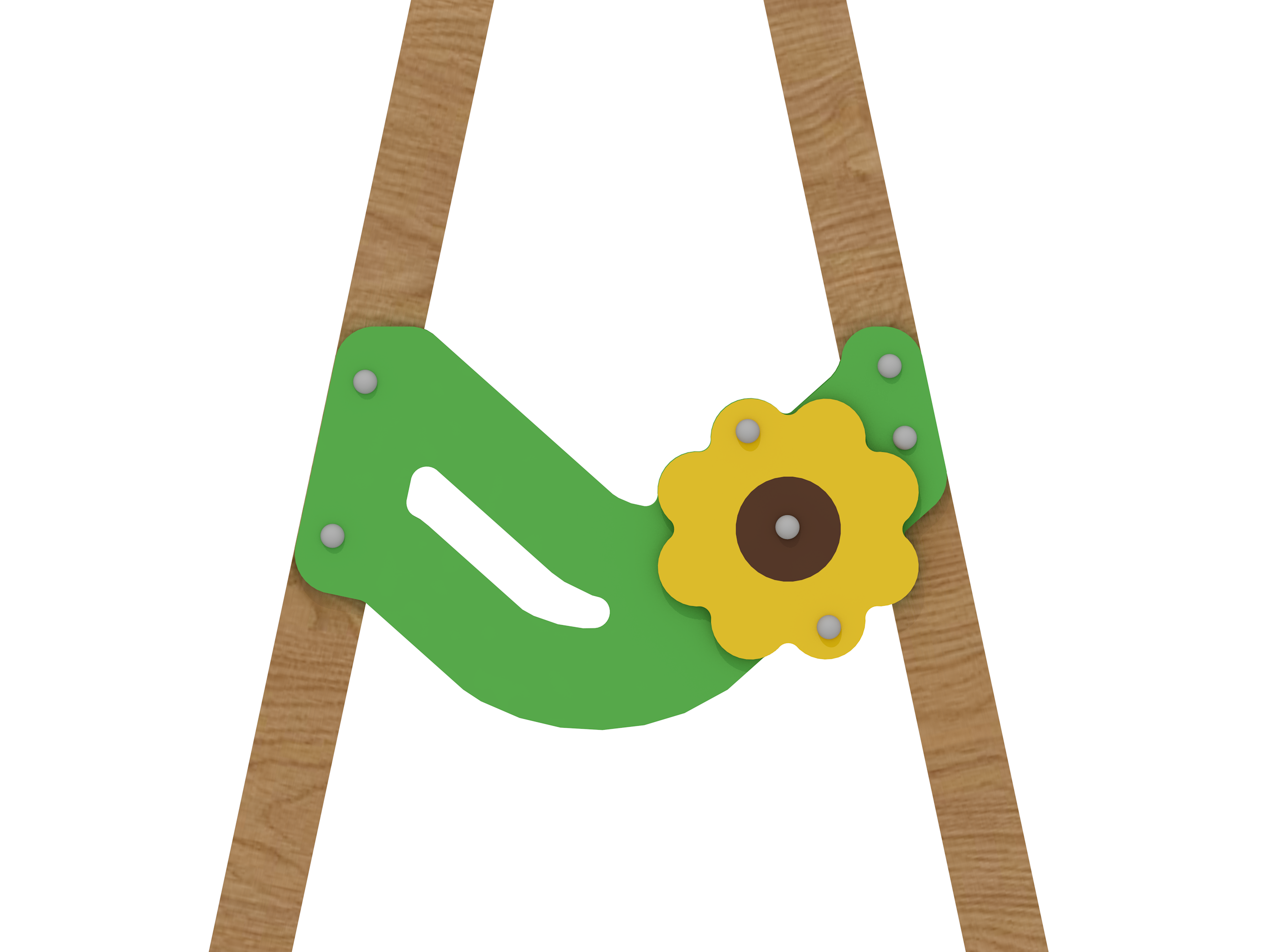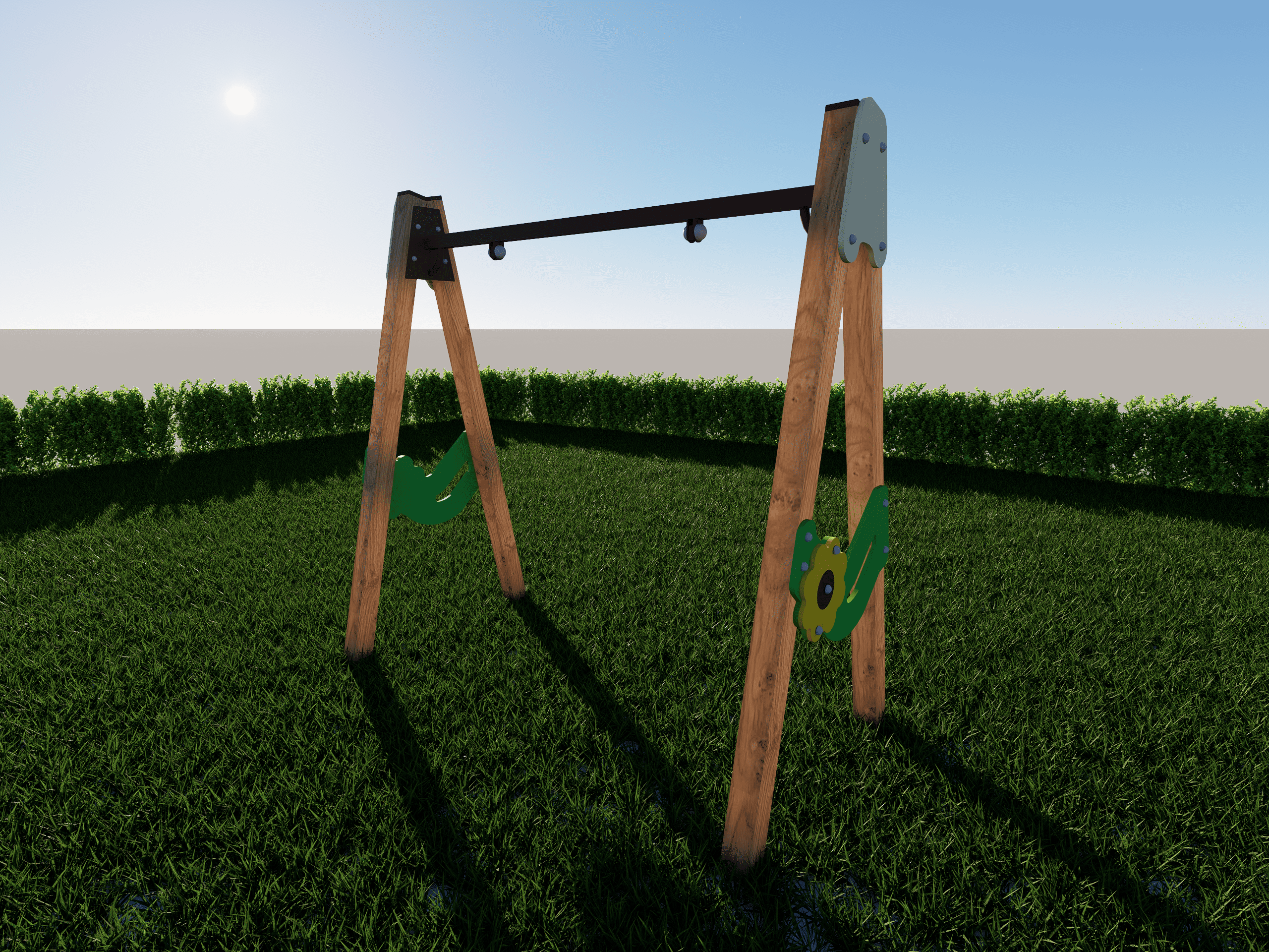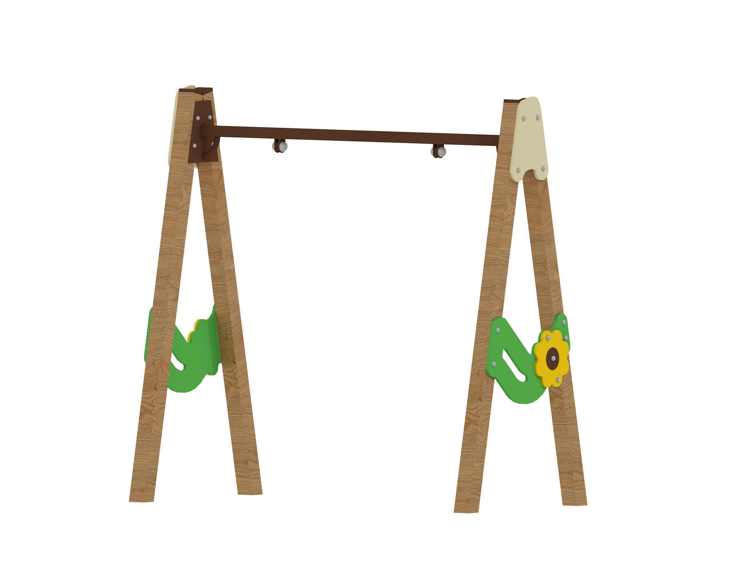 Лаконичная и очаровательная подвесная качель для малышей. Основа — брус 100×100 мм с пропиткой, сиденье и декор из крашеной фанеры, перекладина металлическая.