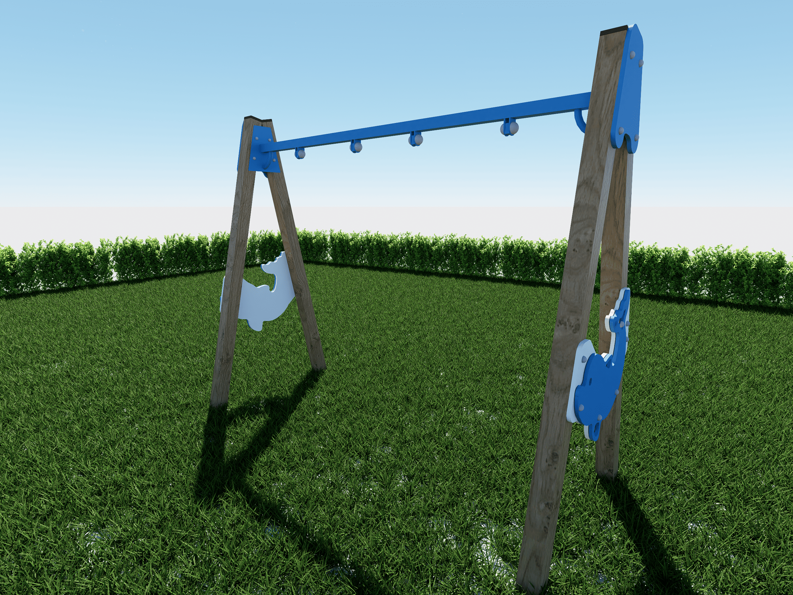 Милая и надёжная подвесная качель для малышей. Состоит из пропитанного бруса 100×100 мм, крашеной фанеры и металлической перекладины — всё просто и безопасно.