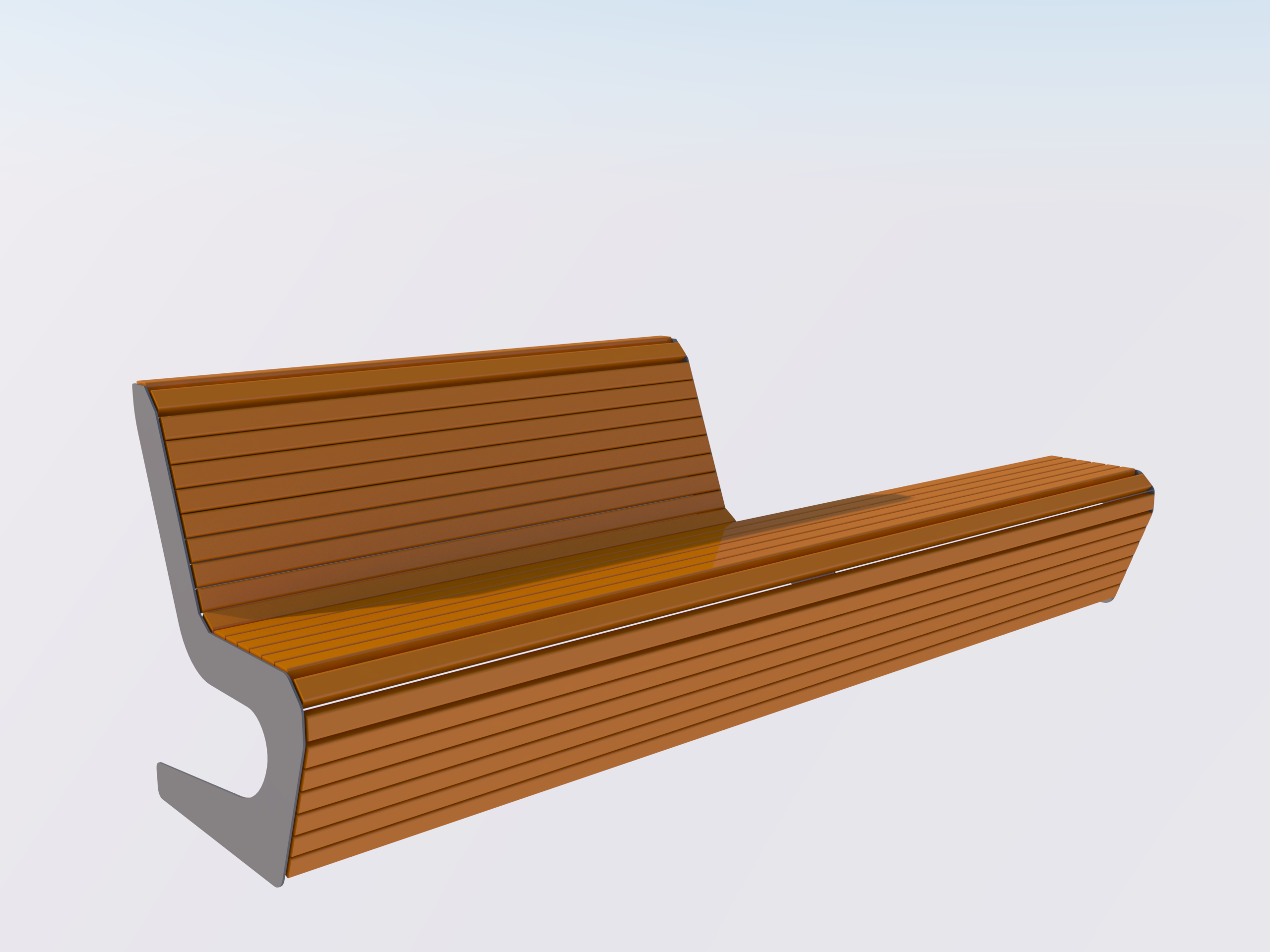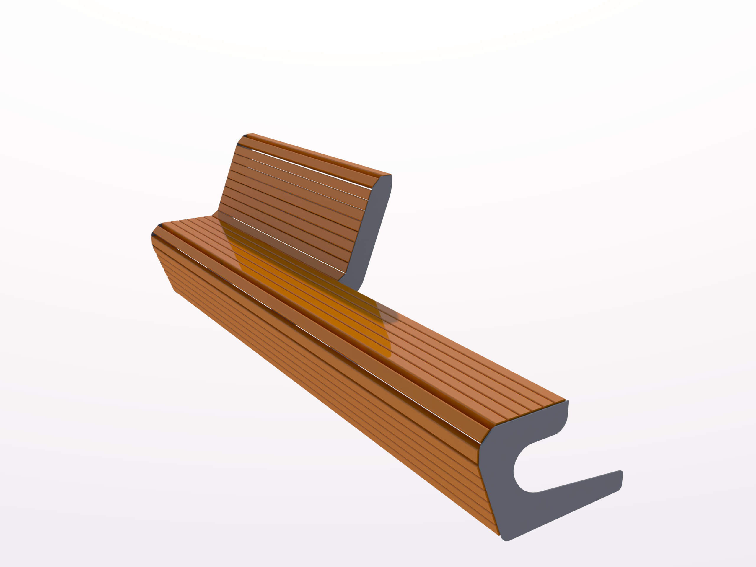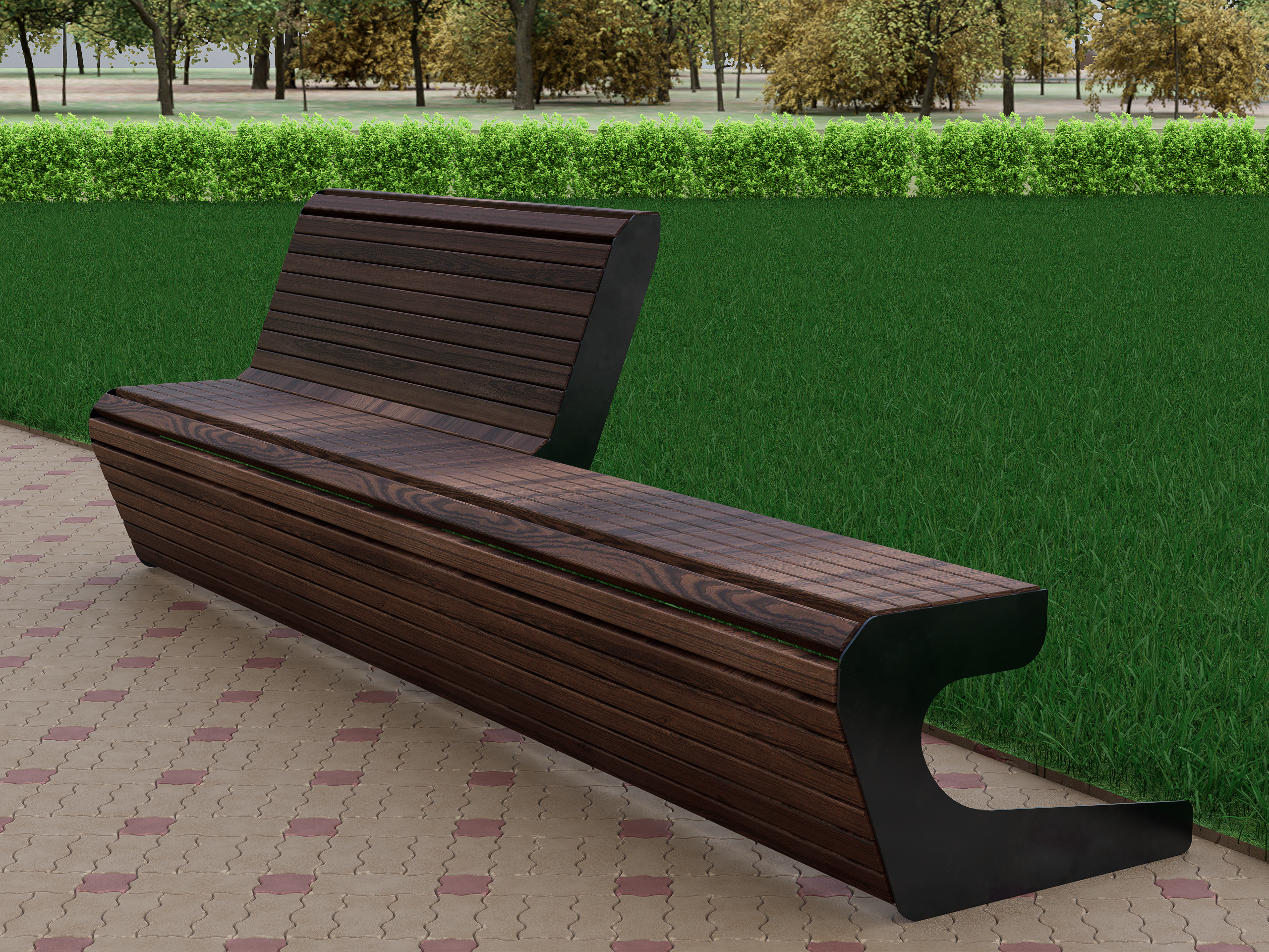 Современная скамья с плавными эргономичными формами, выполненная из металлического каркаса и деревянных ламелей. Изогнутая конструкция обеспечивает комфортную посадку и поддерживает спину, а выразительный дизайн делает модель стильным акцентом в городских и общественных пространствах.