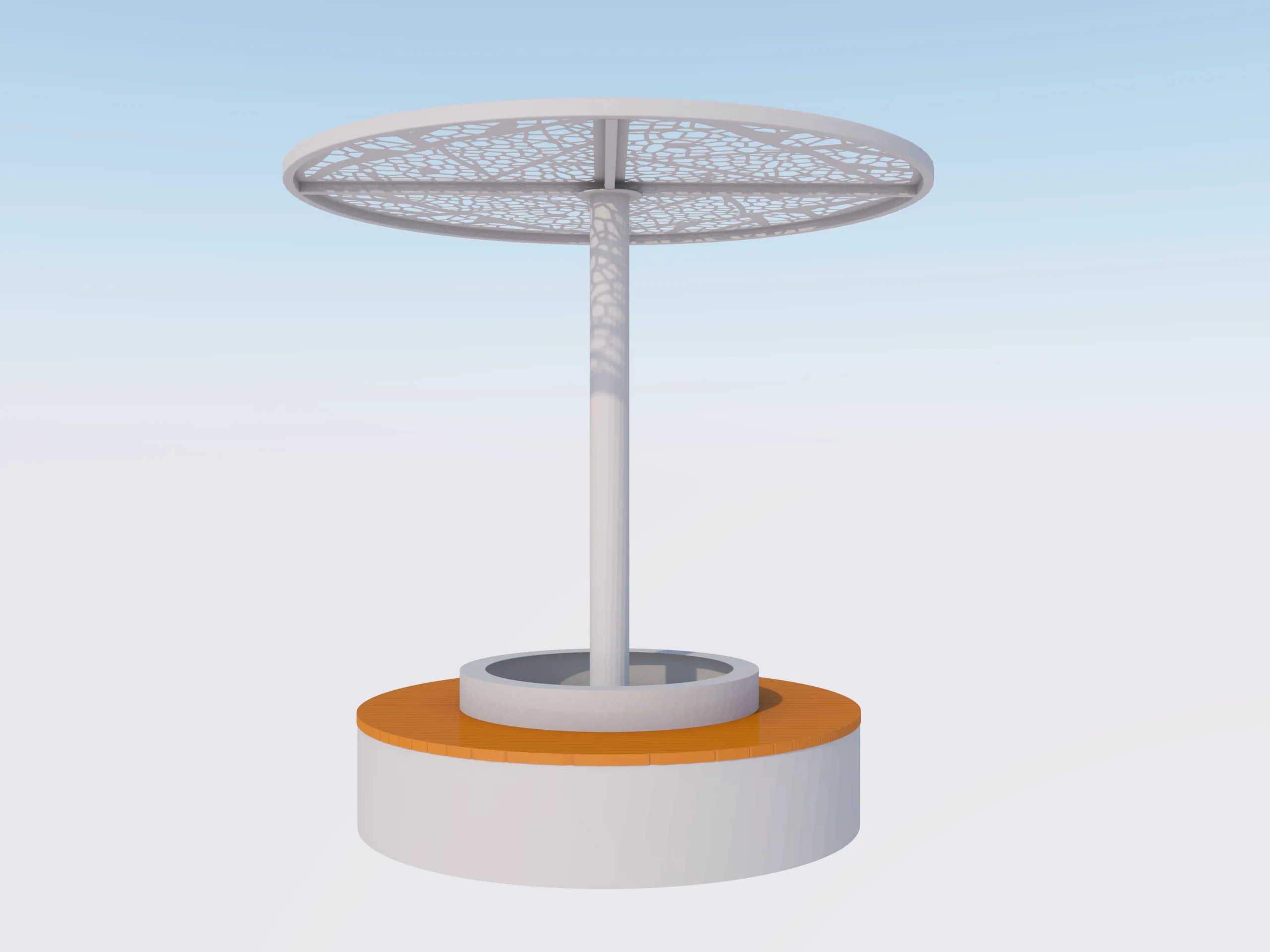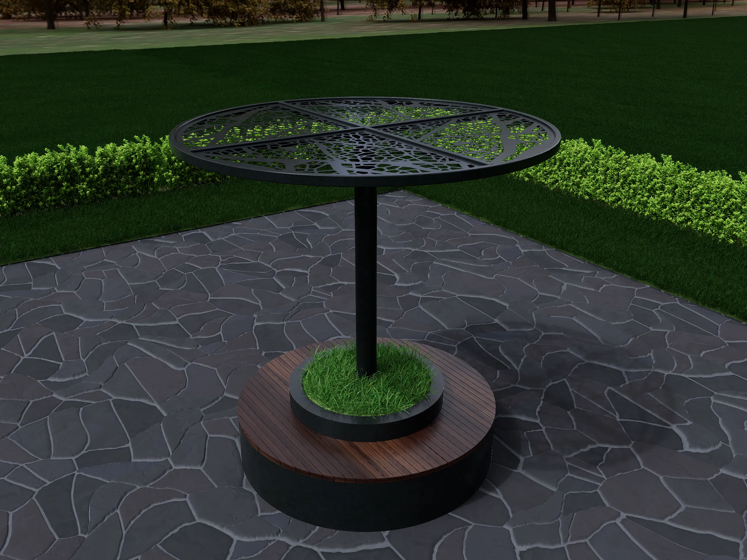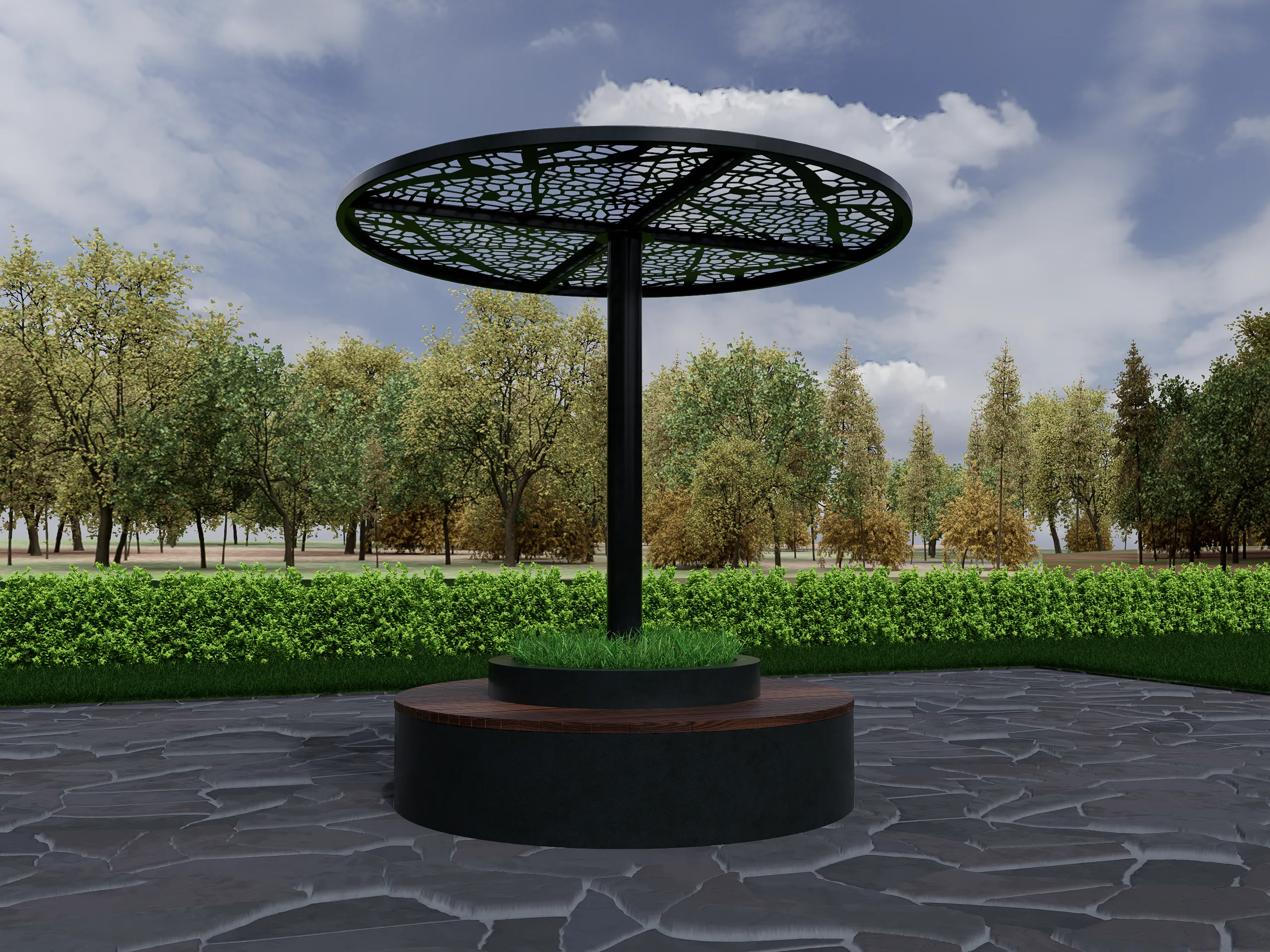 Современная пергола со встроенной скамьёй и декоративным навесом — функциональное решение для зон отдыха в парках, скверах и общественных пространствах. Прочная металлическая конструкция устойчива к погодным условиям, а перфорированный навес создаёт комфортную тень и декоративный световой эффект. Идеально подходит для благоустройства городской и частной территории.