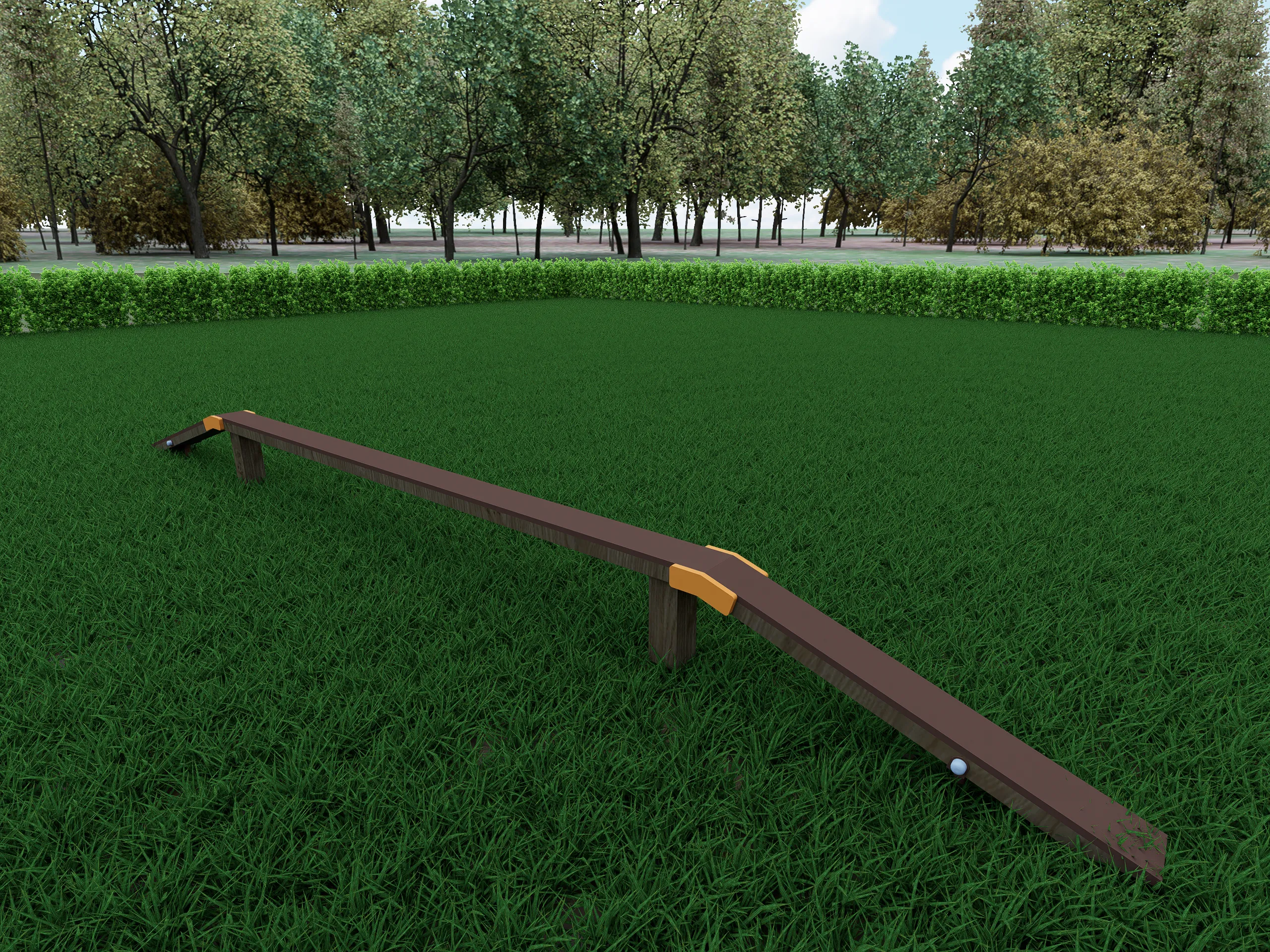 Переходной мостик для детской площадки: длинная деревянная балансировочная доска с двумя наклонными концами, центральной опорой и оранжевыми металлическими креплениями. Поверхность покрыта коричневым покрытием, по краям небольшие круглые ограничители.