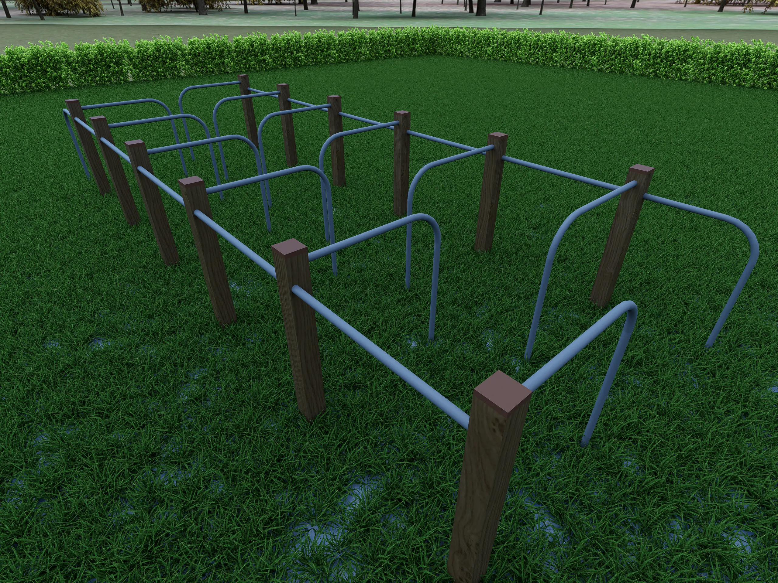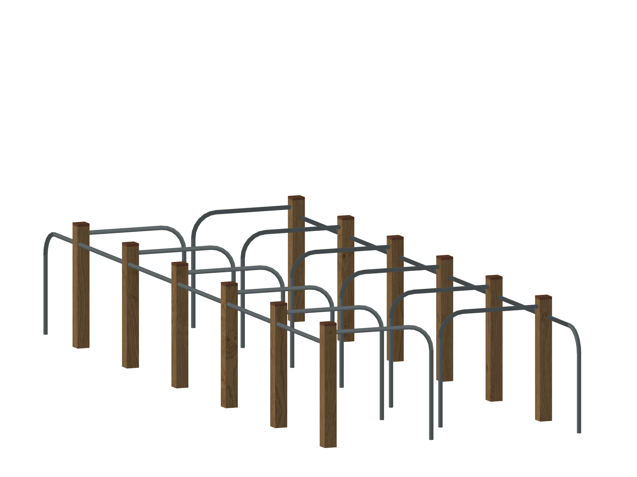 Лабиринт для детской площадки — большая деревянная конструкция с множеством вертикальных стоек коричневого цвета и серыми металлическими дугообразными перекладинами. Создаёт сложный запутанный маршрут для лазания, переходов, баланса и ориентирования. Отлично развивает ловкость, координацию и пространственное мышление. Идеальный выбор для активных приключений и долгих игр на свежем воздухе!