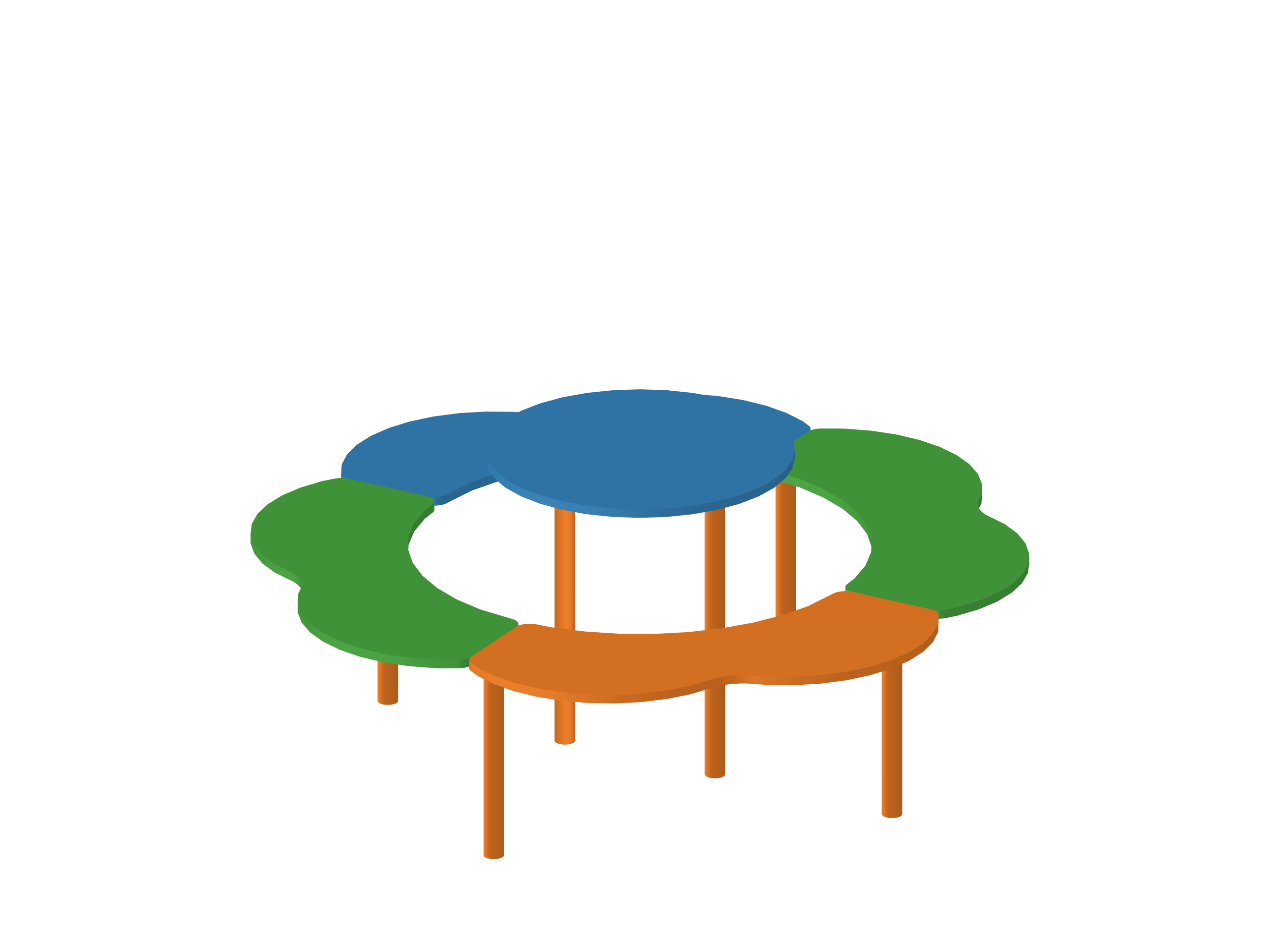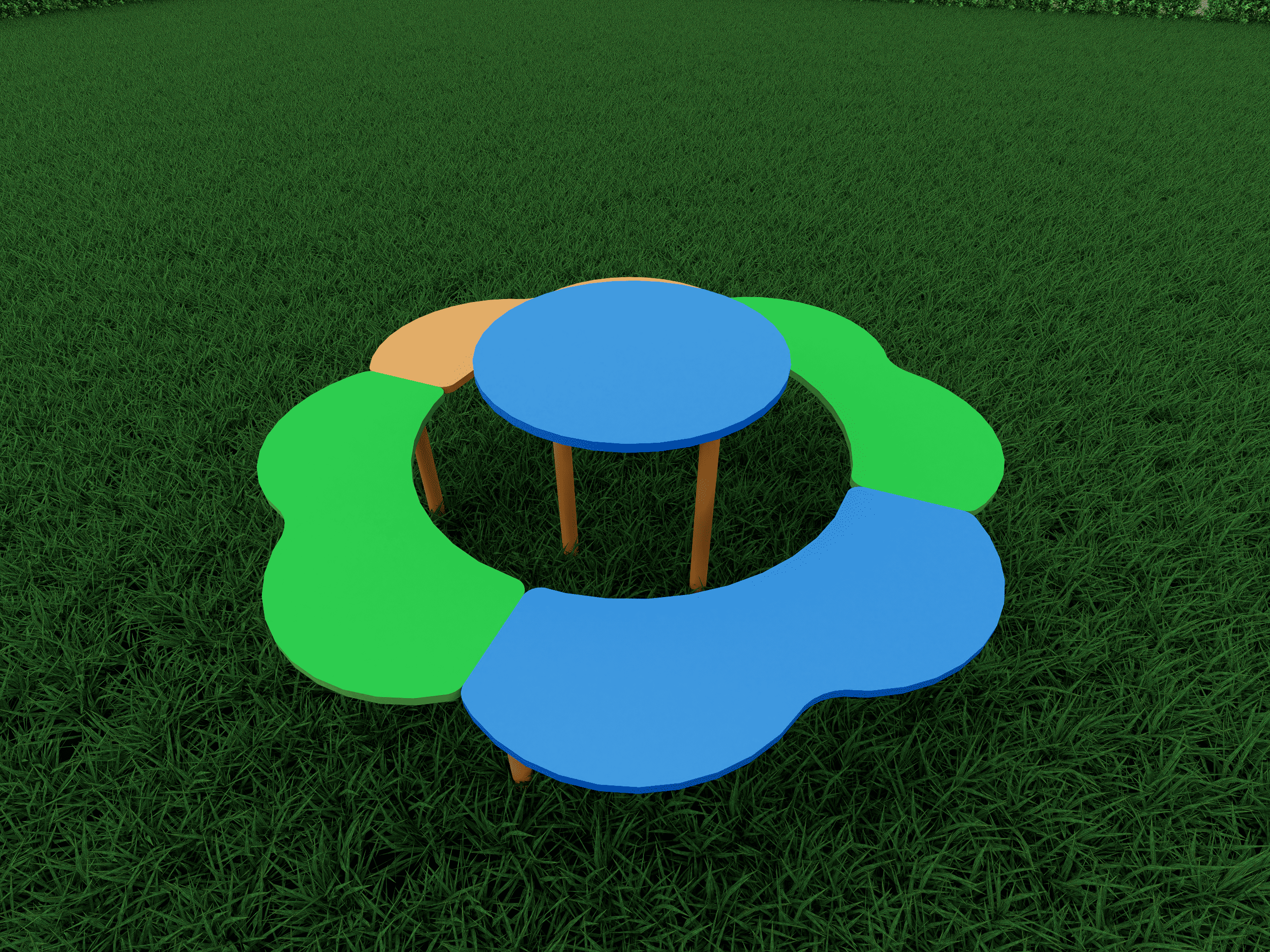 Круглый столик с лавкой в виде лепестков цветка — уютное и безопасное местечко для творчества, игр и первых чаепитий. Прочная комбинация фанеры и металла гарантирует долгую службу, а нежный дизайн станет украшением детской площадки.