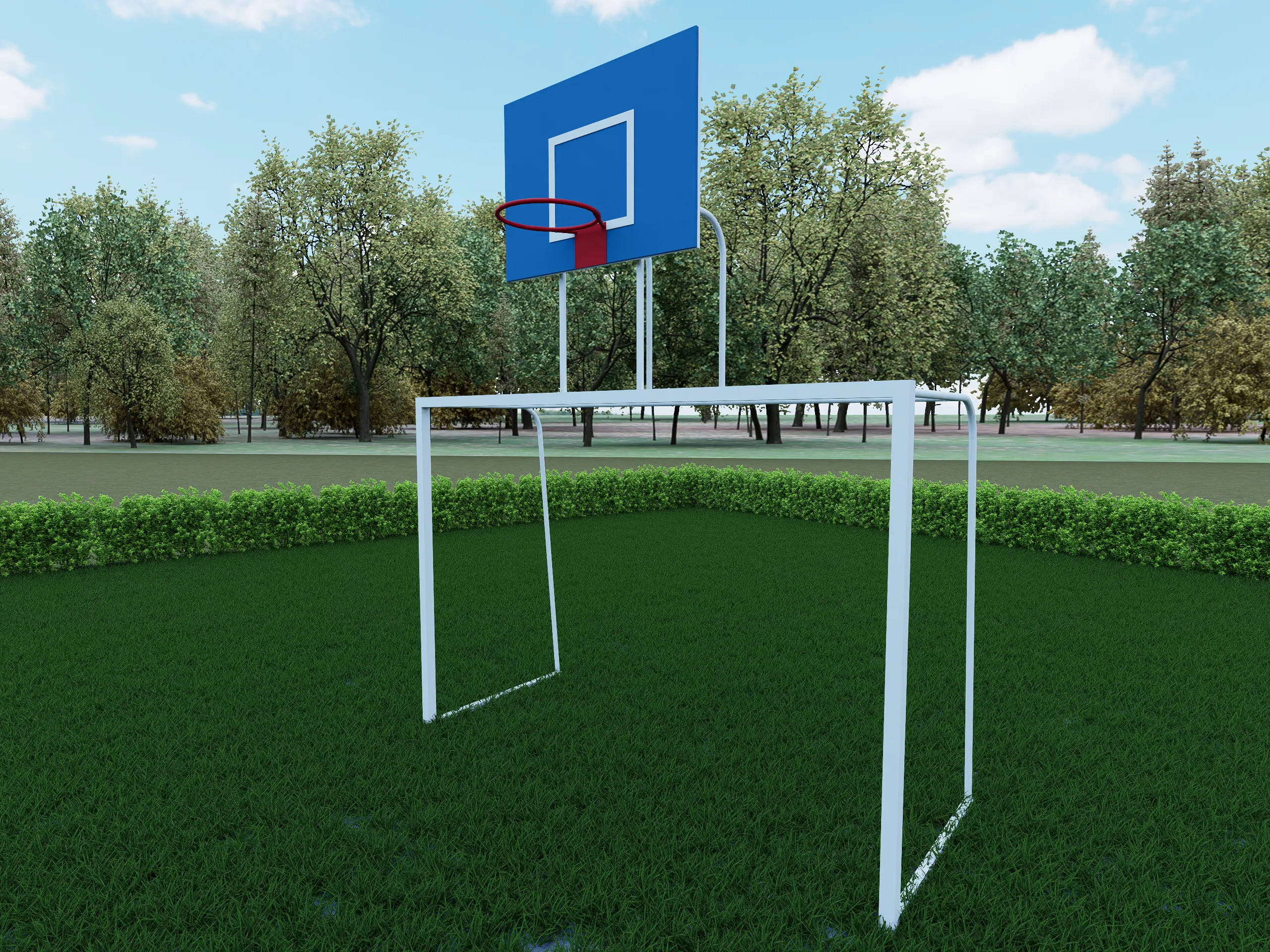 Баскетбольный щит с кольцом и мини-воротами: комбинированный игровой комплекс для детской площадки. Синий квадратный щит с белым квадратом и красным кольцом, установлен на белой металлической раме. Внизу прямоугольная белая рамка-ворота для игры в мини-футбол или комбинированных игр. Универсальный элемент для баскетбола, футбола и активного отдыха детей.