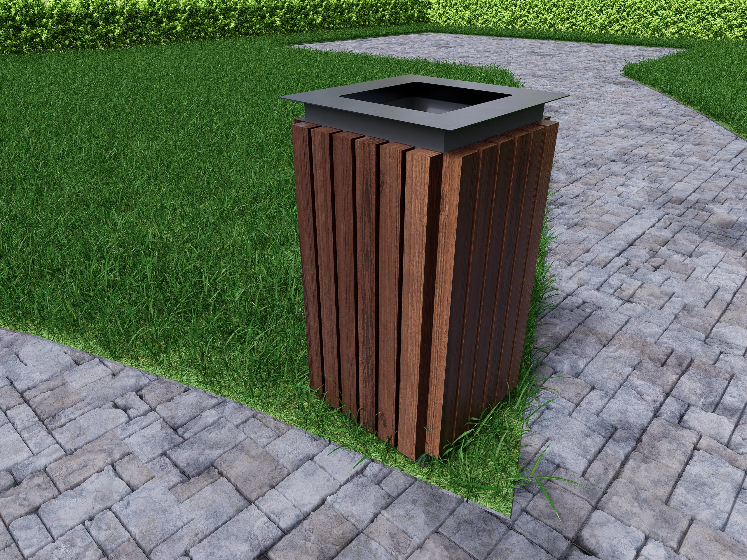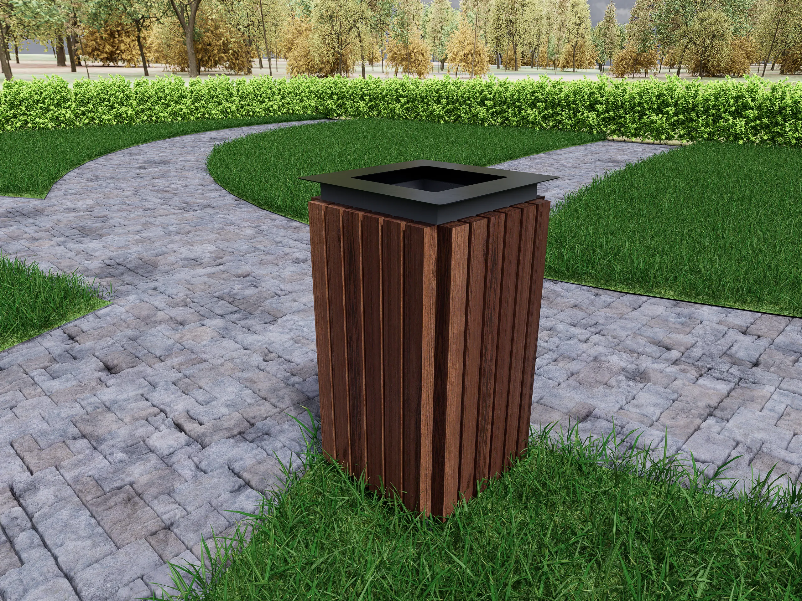 Современная уличная урна с декоративной отделкой из деревянных ламелей — стильное и практичное решение для парков, скверов и общественных пространств. Прочная металлическая конструкция устойчива к погодным условиям, а лаконичный дизайн гармонично вписывается в любой ландшафт. Идеально подходит для благоустройства городской среды и частных территорий.