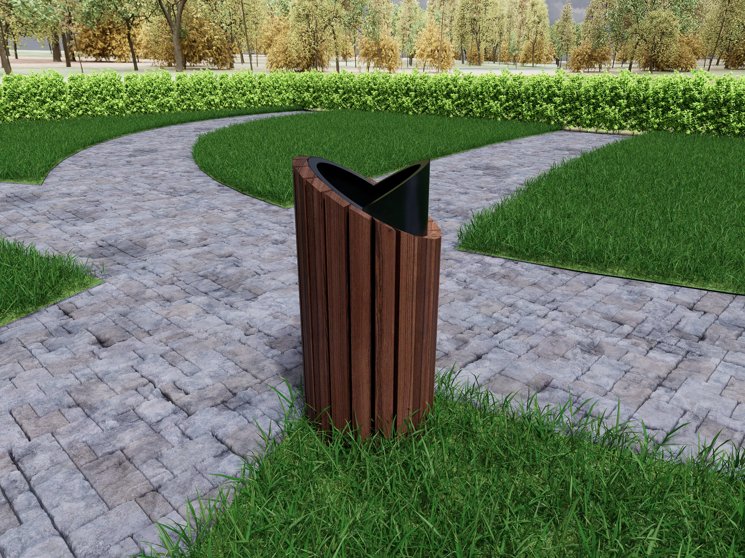 Уличная урна с оригинальной асимметричной формой и декоративными деревянными ламелями — современное решение для благоустройства парков, скверов и общественных зон. Прочный металлический корпус устойчив к влаге и перепадам температур, а стильный дизайн привлекает внимание и гармонично дополняет ландшафт. Отличный выбор для городской среды и частных территорий.