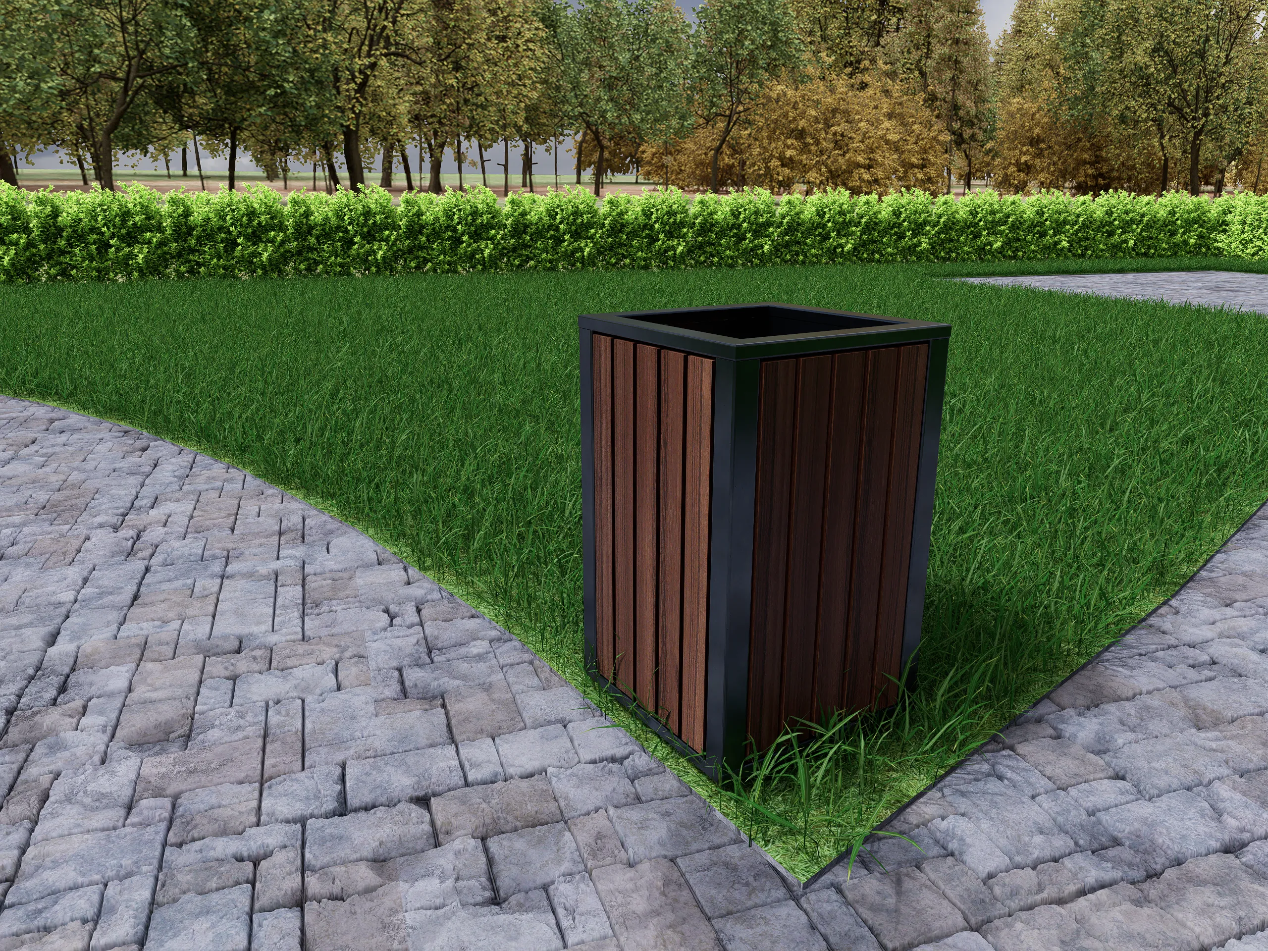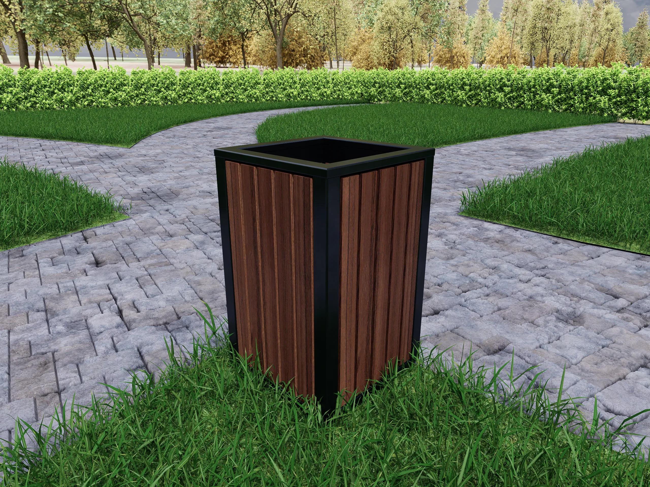 Уличная урна в строгом современном дизайне с металлическим каркасом и облицовкой из деревянных ламелей — практичное решение для благоустройства парков, дворов и общественных пространств. Надёжная конструкция устойчива к погодным условиям, а лаконичный внешний вид легко вписывается в городскую и частную среду. Отличается долговечностью и удобством эксплуатации.