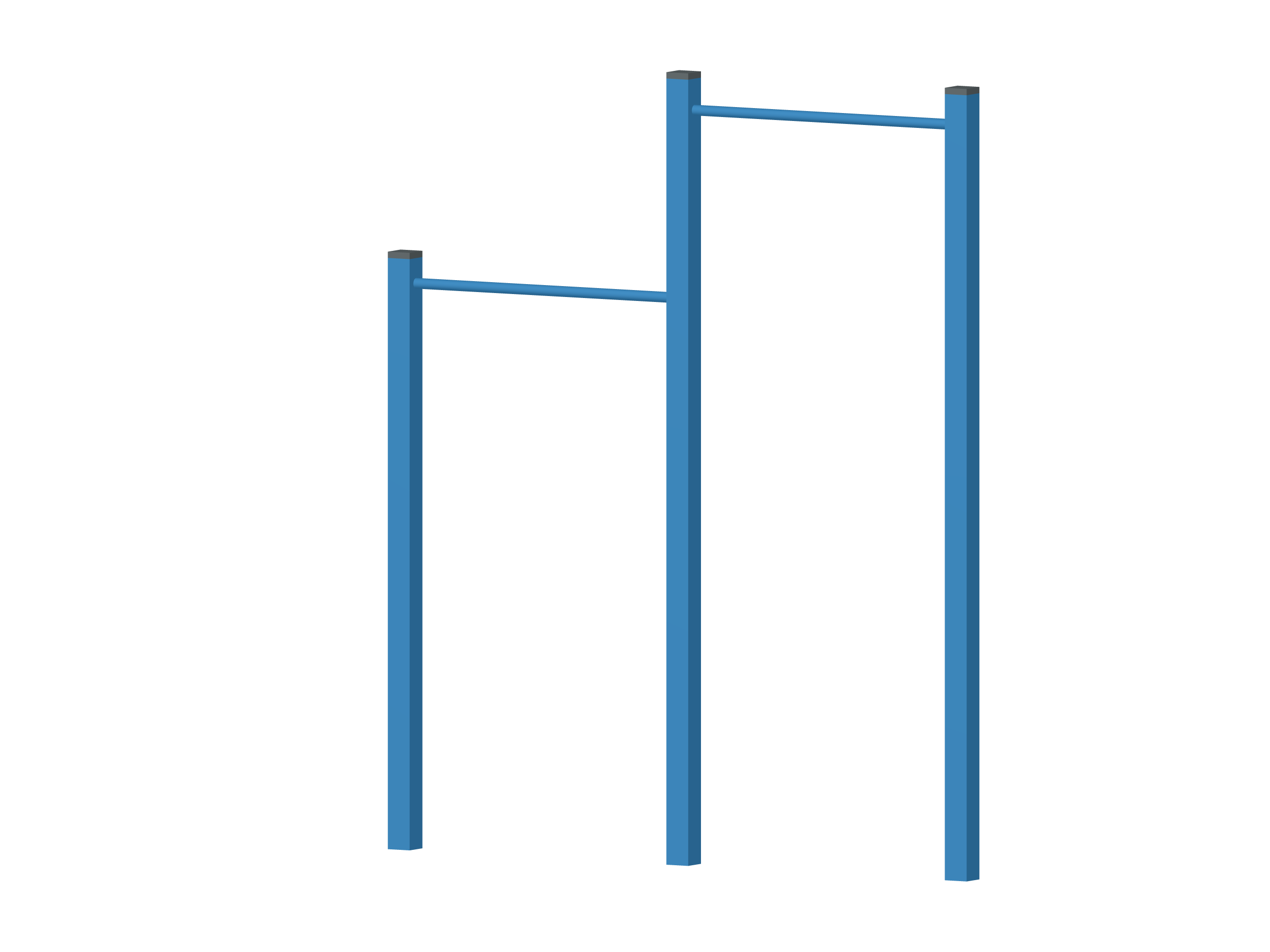 Турник с двумя перекладинами для детской площадки: металлическая конструкция синего цвета с двумя вертикальными стойками и горизонтальными перекладинами на разной высоте для подтягиваний.